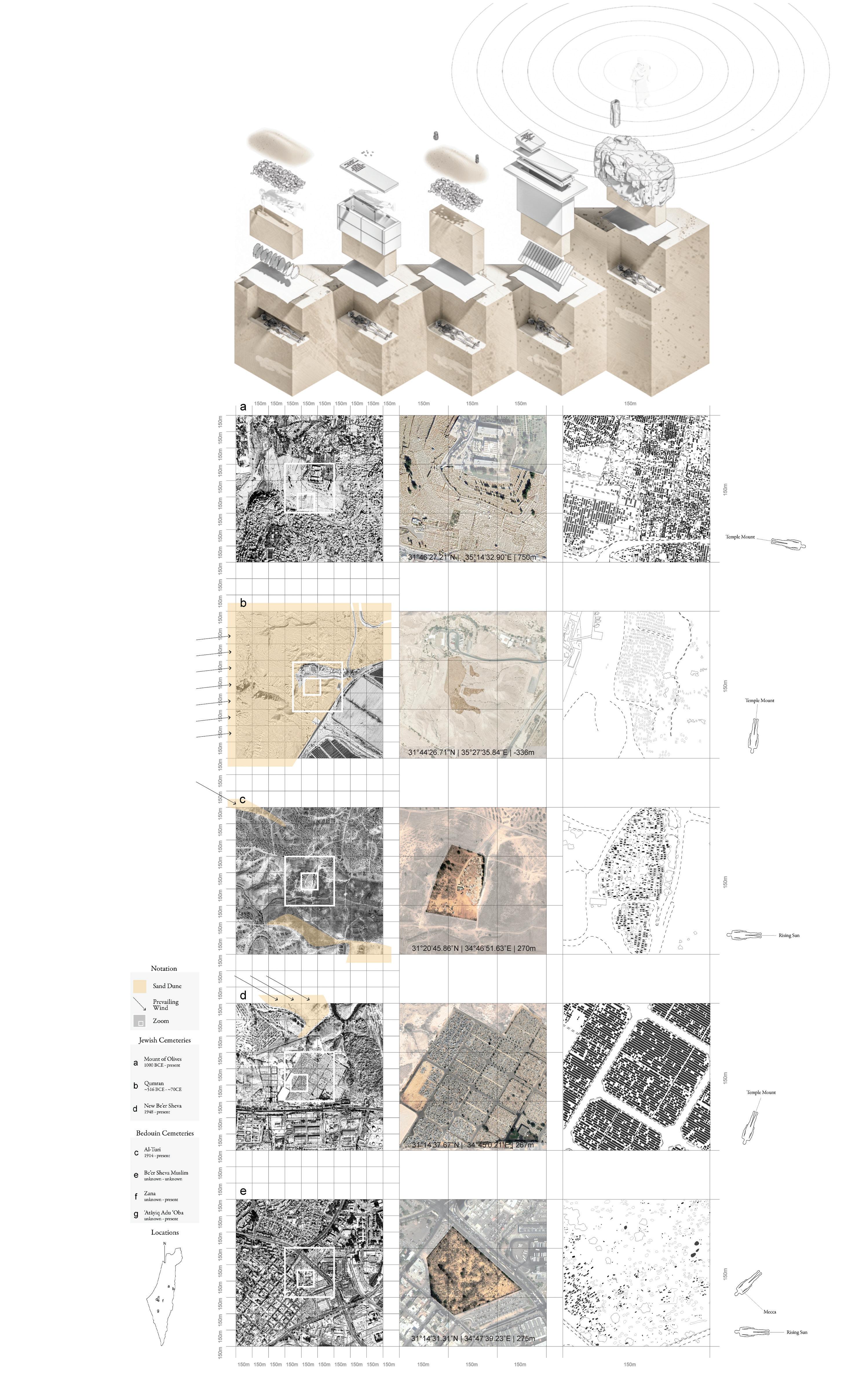 In order to maintain the sanctity of burials now and in the future, bodies of Jews, Bedouin, Muslims, and Christians are buried alongside one another in a multifaith necropolis. A funerary structure buried beneath the hill acts as the threshold between living and dead. As one moves into the earth, the path turns with the East - West axis, aligning with all three abrahamic entry sequence conventions. Inside, a communal ritual washing area can be found where benches are provided for muslim visitors and cups for jewish visitors. Preparations of the deceased take place behind the washing wall. After washing, the dead and the living descend deeper into the earth before rising again into the main prayer chamber. Sinuous burial plots grow out of the prayer chambers and weave along the topography where the deceased of diverse cultures share common ground.