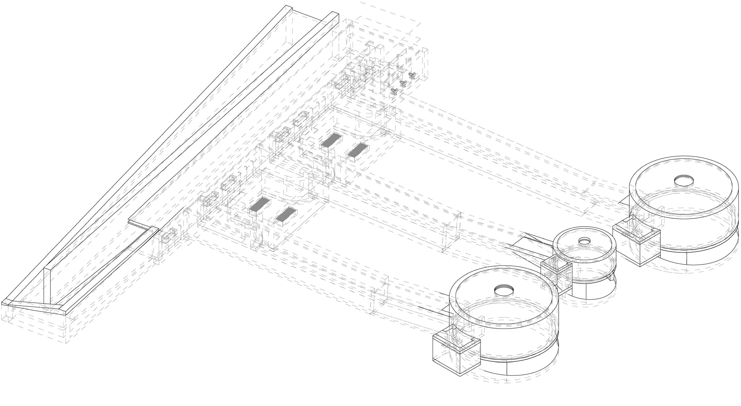 The building has no defined program. It is derived from two pre-determined sections as an exercise in resolving seemingly incompatible drawings. (pictured right)