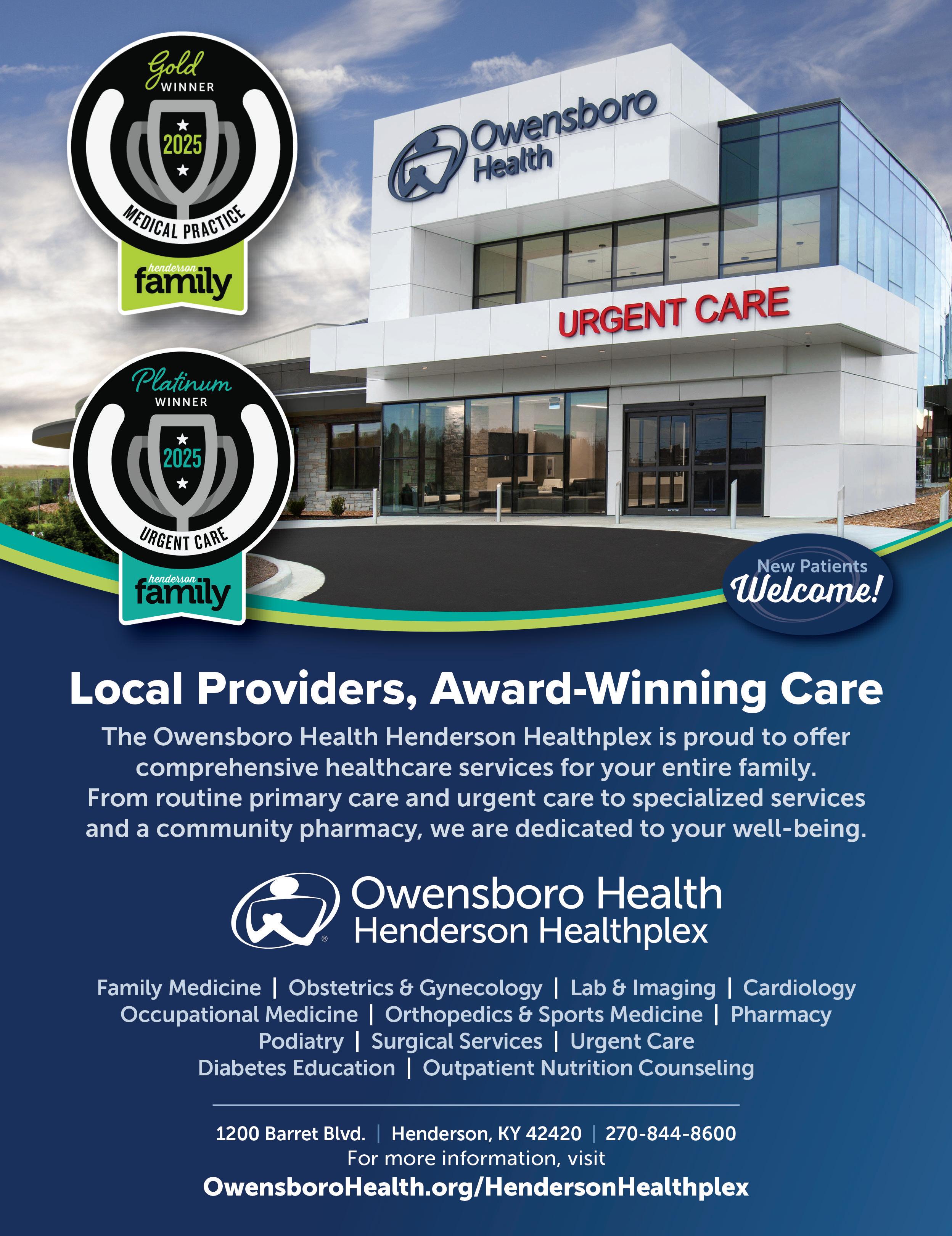 A Daviess County-based health system extended its network into Henderson County in early 2018. The Owensboro Health Henderson Healthplex outpatient facility offers walkin laboratory services, an urgent care center and expertise in primary care, family medicine, sports medicine, orthopedics, podiatry, cardiology, diabetes education, nutrition counseling, behavioral health, mammography/radiology/imaging, obstetrics and gynecology, occupational medicine, and bone loss and osteoporosis.