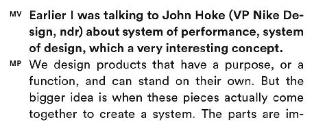 “I’ll start by saying one of the key burning platforms for design going forward is owning the system of performance. And what we mean by that is taking all the individual great items that we make and building those items together so that the system works more symbiotically, more in harmony with the athlete’s body and I think that’s a competitive advantage because we’re going to build an entire head to toe look. That look is a unique advantage for us, that look is something that we get to own, that is a continuous opportunity for us to tell and show the public where we’re taking athletics. So when you talk about designing a system, you can’t think individual things, the system is built from great items which are made up of great details and they all come together to create this unique statement, unique performance system. So I was asking the teams at the design review to think about a couple things, systems for me really focus on where things intersect and where things interface and those intersections and interfacing of product ideas is where we’re going to go deep on. So how the sock and the shoe work symbiotically. How the tight and the uniform work symbiotically. How the system works together is something I want to absolutely focus on. The advantage for athletes is Nike gets to put it all together. Every detail, every material, every little nuance of a product comes together in harmony to help the athlete be great.”