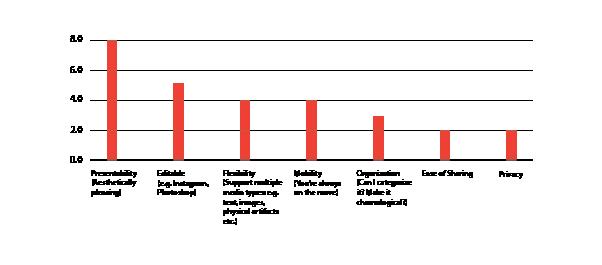Designers felt very strongly about how important the presentability of their inspirational finds were. Half of the designers felt that presentability was the important factor when choosing an application. The other half felt that it was not very important at all. A complete clustering technique was used to group users based off of similarities across their perceived ranking for different categories. There was not enough data to create many definitive clusters, but there is strong evidence of a singly defined group of designers that prioritize presentability and editability.