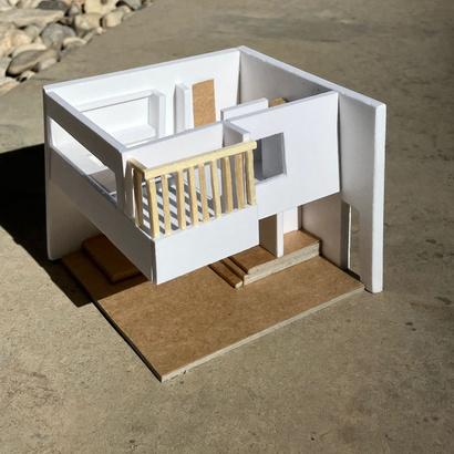 Por el tercer bloque se accede a la vivienda y se permite acceder a la segunda planta gracias a unas escaleras curvas También da acceso al patio que ya deja de ser interior debido al giro de los volúmenes y pasa a ser interior pero dos de sus caras se muestran al interior Para acceder a las habitaciones y cocina hay una segunda altura en la primera planta. Una de las habitaciones muestra un pequeño patio que da al exterior.