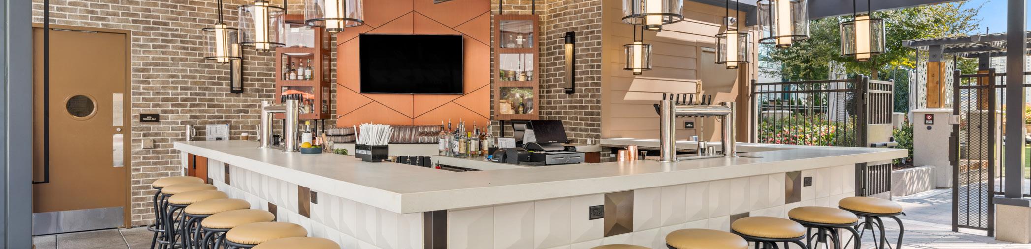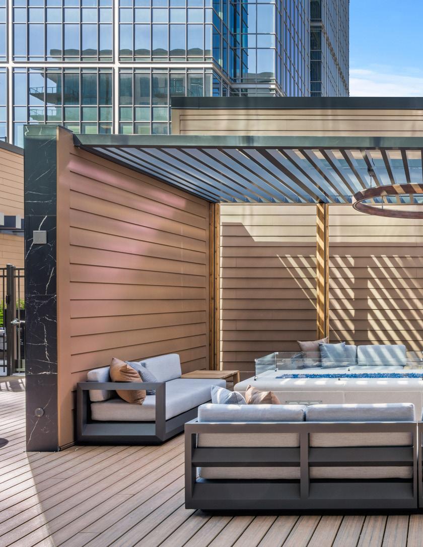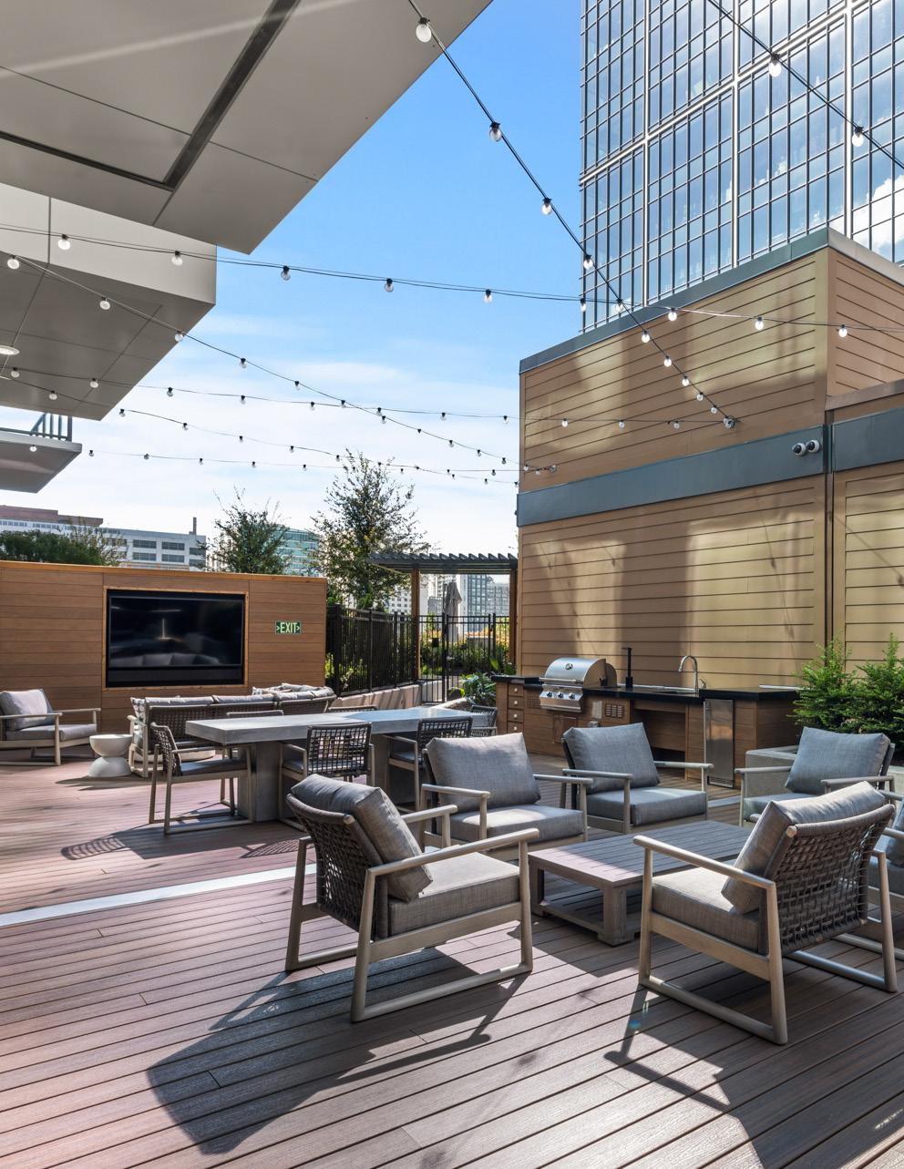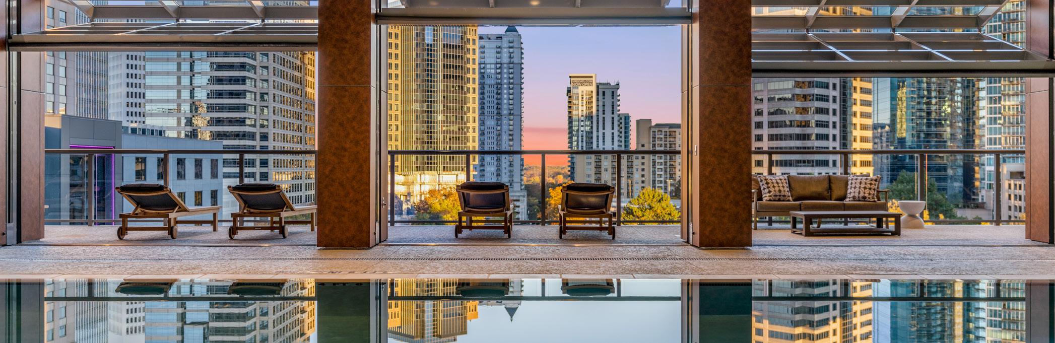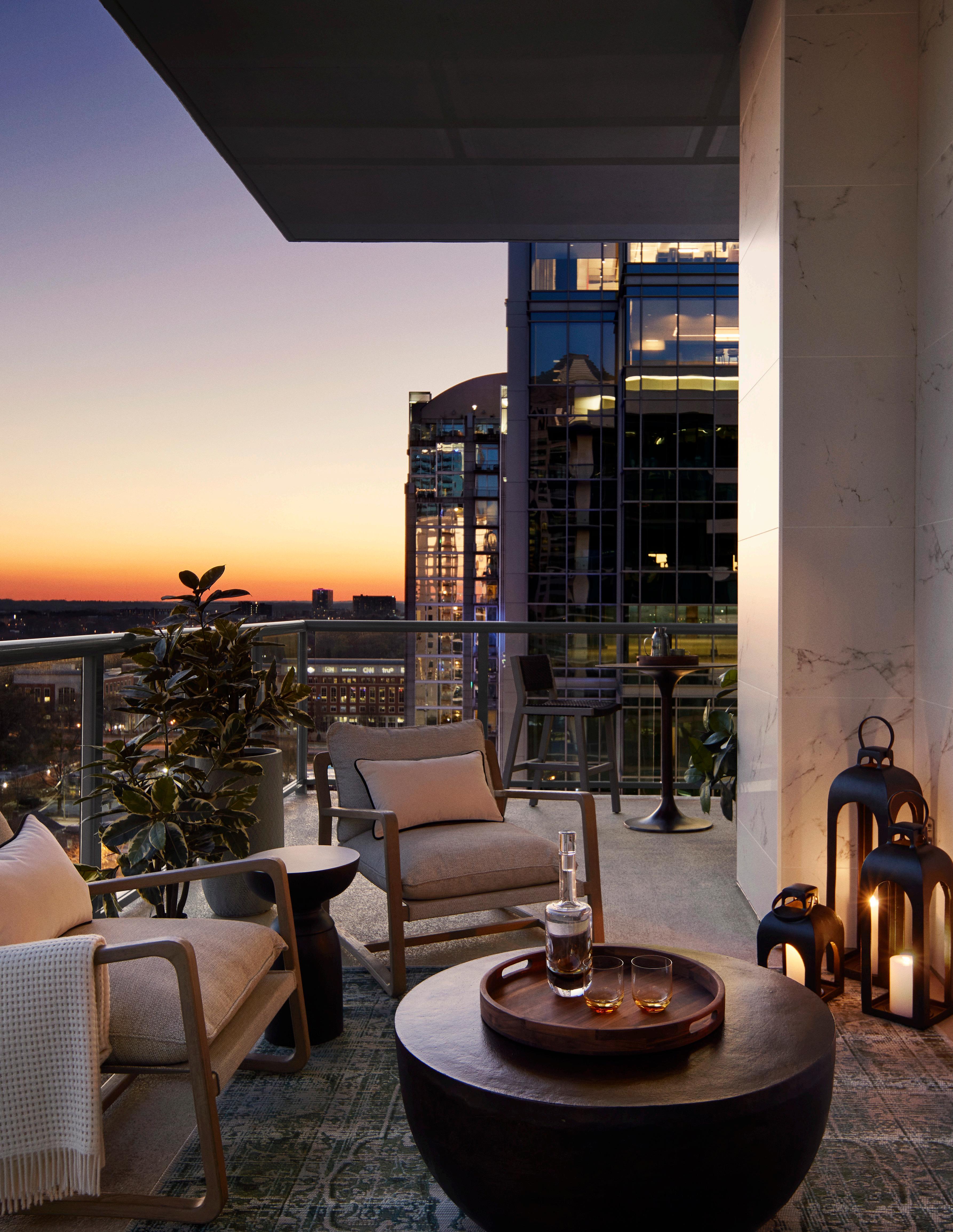 Overseeing grand city views, the sky terrace offers direct access to the Aerial Kitchen & Bar and Epicurean Atlanta’s pool. The lush courtyard features shaded gathering areas, sun-soaked seating, an elongated firepit, and well-groomed landscaping.