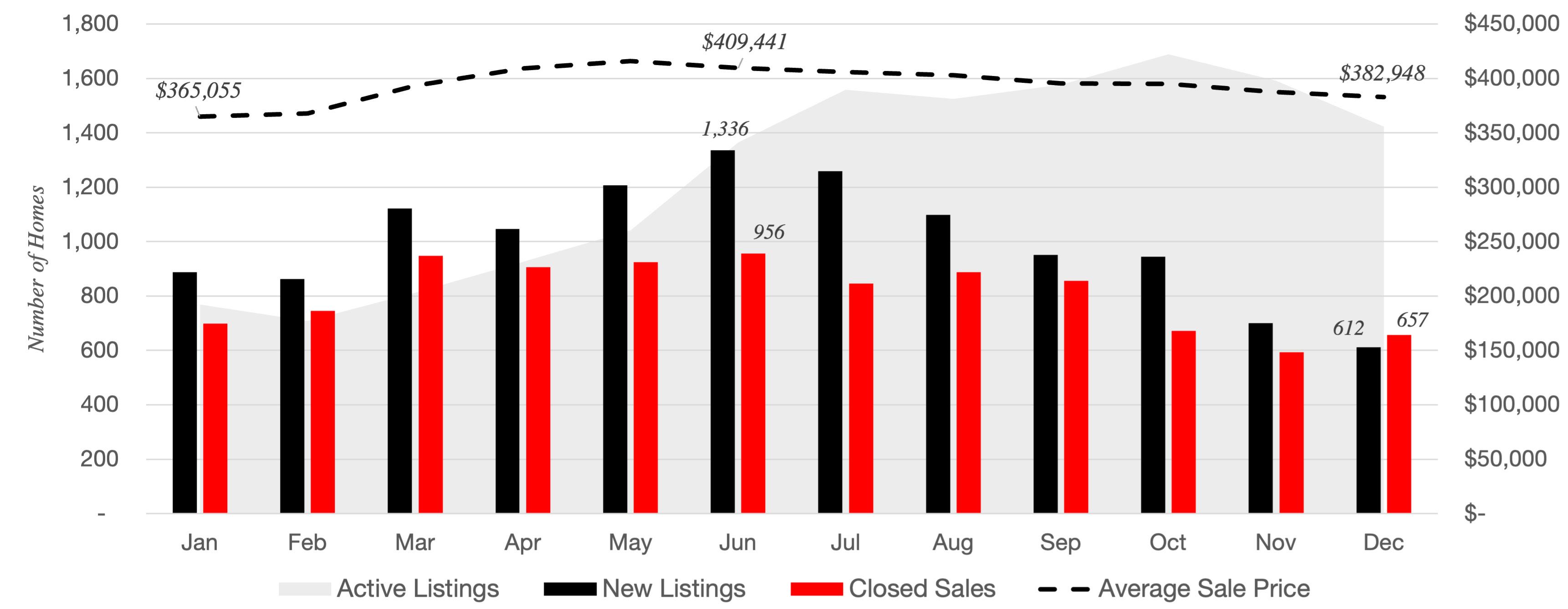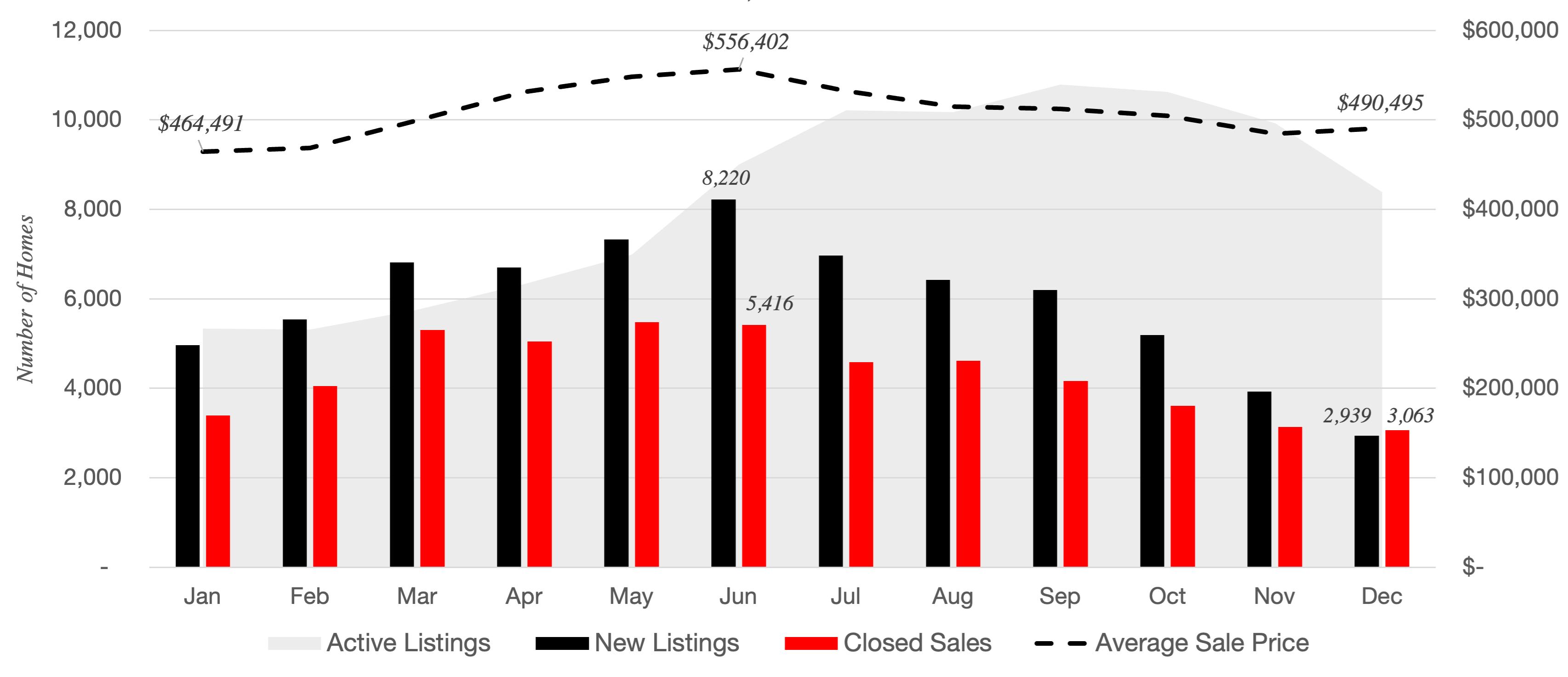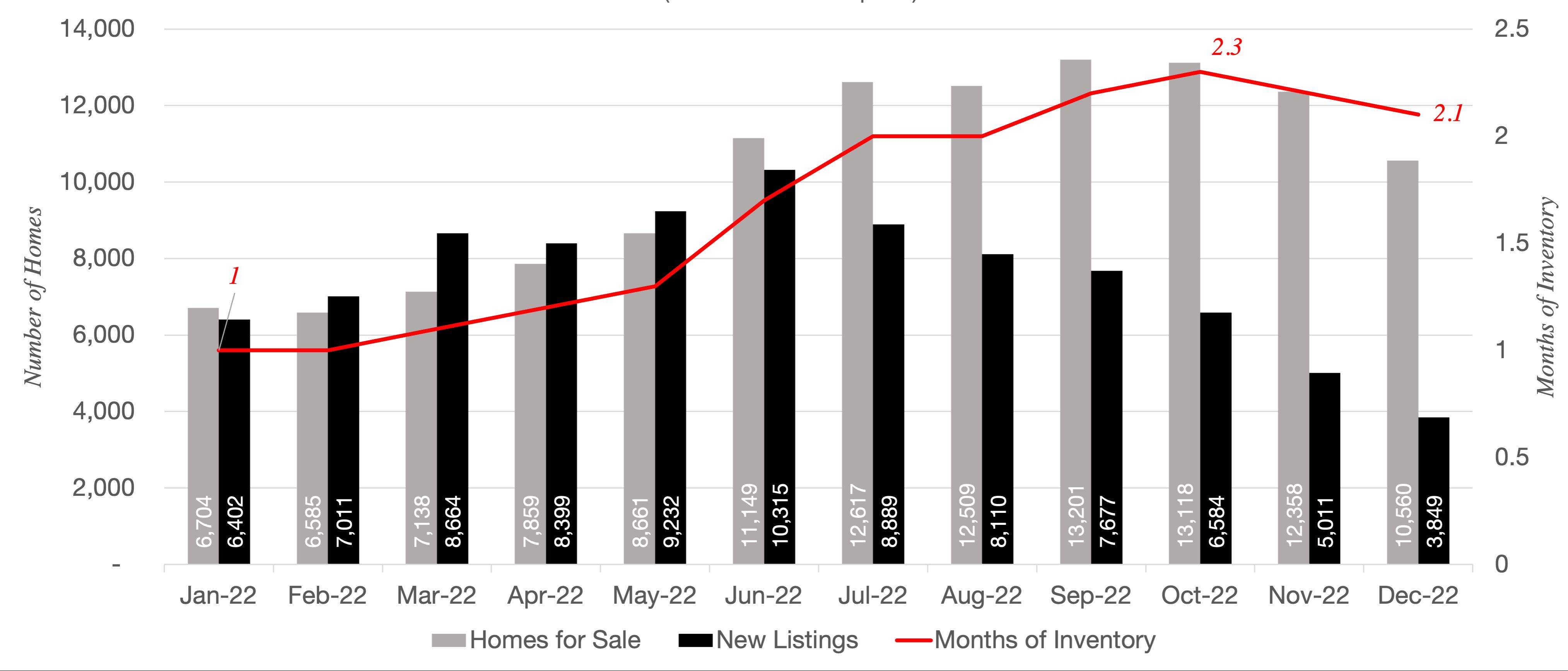Market inventory is rising but still low with 2.1 months of inventory in Metro Atlanta overall at year end. Demand is down, but so is supply, which is helping to limit significant price declines. While prices are down slightly compared to the summer peak, this reflects an accelerated version of normal seasonal price fluctuations. Notably, the average sales price in Metro Atlanta in the second half of 2022 was still up 9.9% year over year. New listings have been down every month since June, which is, again, an accelerated version of a normal seasonal trend. Inventory reached its lowest level in a decade in December of 2022.