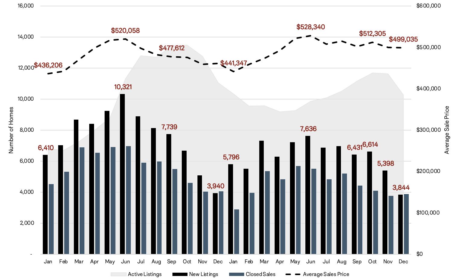 There were 11,739 closed sales in Q4 which is 18.75% less than the 14,445 in Q3 2023. The average price remained stable, decreasing by only 0.93% from $508,532 to $503,820. Inventory levels crept up to 2.5 months over 2 months in the previous quarter and, the average days on market increased by 5 days from 27 to 32.