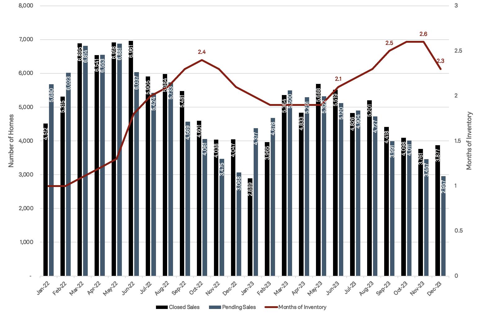Metro Atlanta Pending and Closed Sales vs. Interest Rates (January 2022 - December 2023)