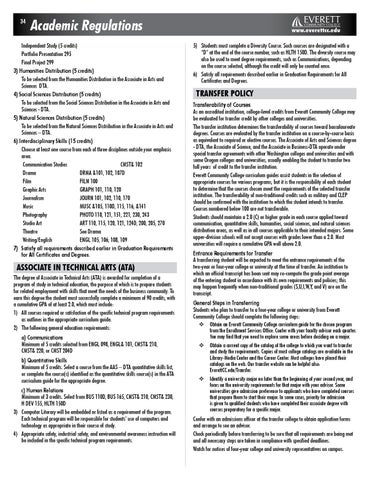 Independent Study (5 credits) Portfolio Presentation 295 Final Project 299 3) Humanities Distribution (5 credits) To be selected from the Humanities Distribution in the Associate in Arts and Sciences DTA. 4) Social Sciences Distribution (5 credits) To be selected from the Social Sciences Distribution in the Associate in Arts and Sciences - DTA. 5) Natural Sciences Distribution (5 credits) To be selected from the Natural Sciences Distribution in the Associate in Arts and Sciences – DTA. 6) Interdisciplinary Skills (15 credits) Choose at least one course from each of three disciplines outside your emphasis area. Communication Studies CMST& 102 Drama DRMA &101, 102, 107D Film FILM 100 Graphic Arts GRAPH 101, 110, 120 Journalism JOURN 101, 102, 110, 170 Music MUSC &105, 110D, 115, 116, &141 Photography PHOTO 110, 121, 151, 221, 230, 243 Studio Art ART 110, 115, 120, 121, 124D, 200, 205, 270 Theatre See Drama Writing/English ENGL 105, 106, 108, 109 7) Satisfy all requirements described earlier in Graduation Requirements for All Certificates and Degrees.
