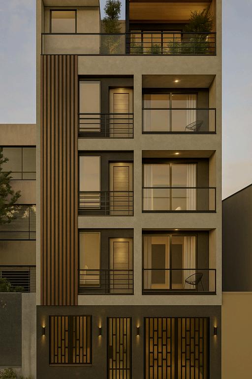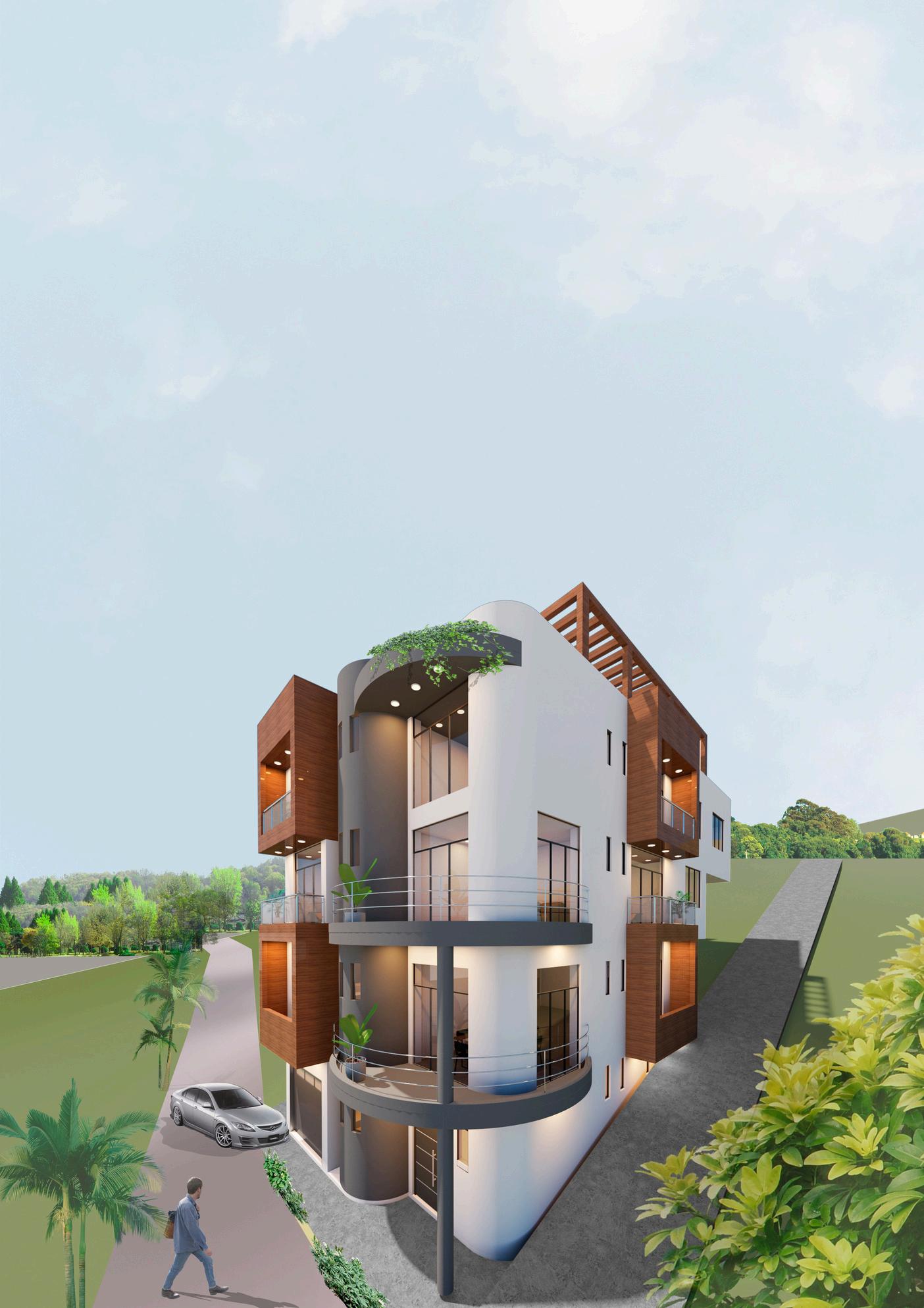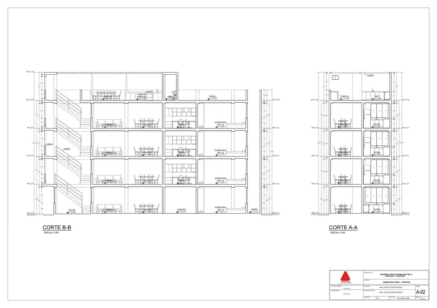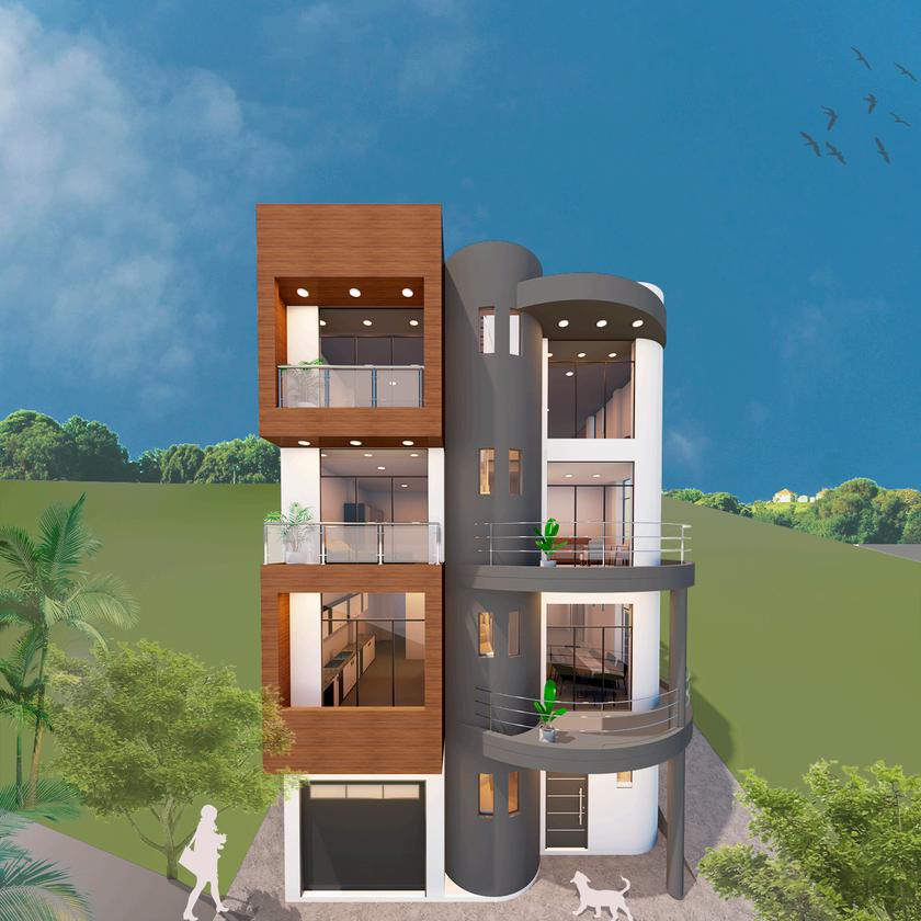 Es una vivienda multifamiliar de 4 niveles mas terraza, cuenta con una área de 140 m2. En el primer piso se propuso una pequeña tienda y un departamento en la parte posterior, los niveles superiores están divididos en departamentos de 3 dormitorios mas un mini departamento para alquiler ubicado en la parte delantera de cada piso.