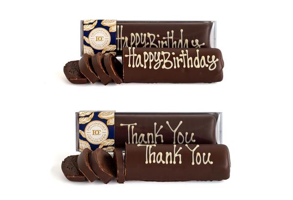 Chocolate truffle slice with Happy Birthday or Thank You in white chocolate.