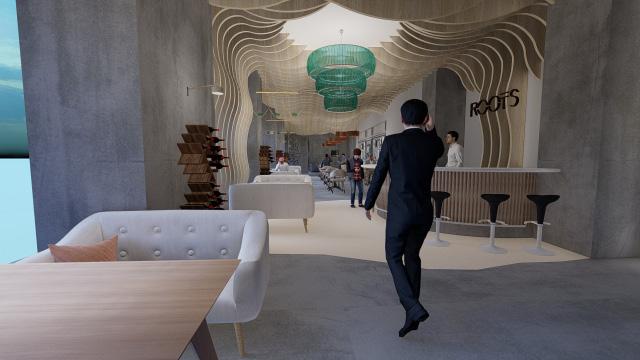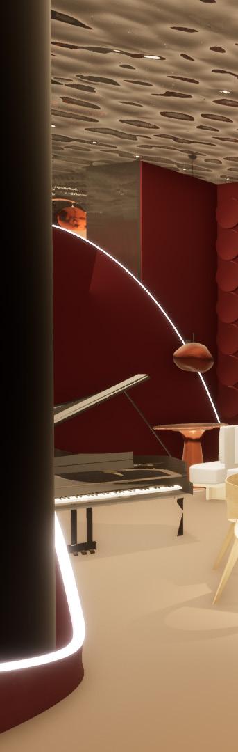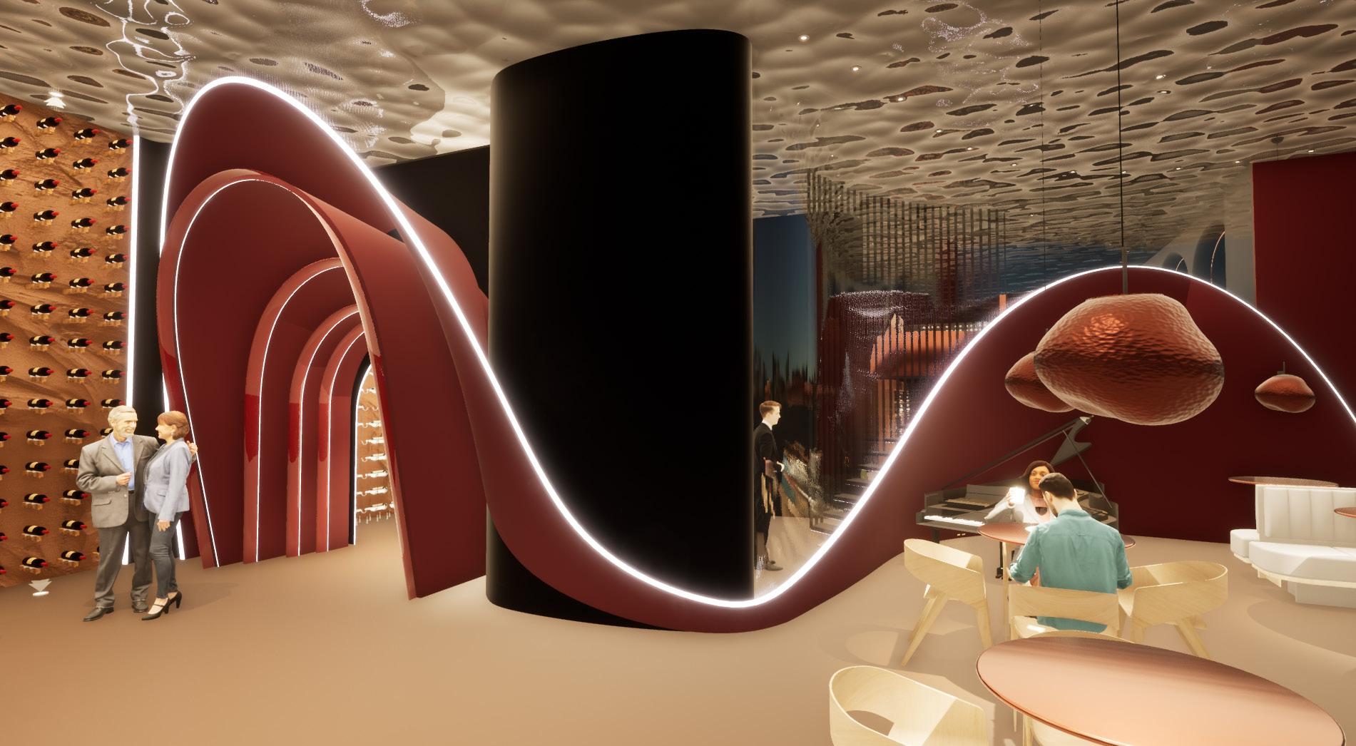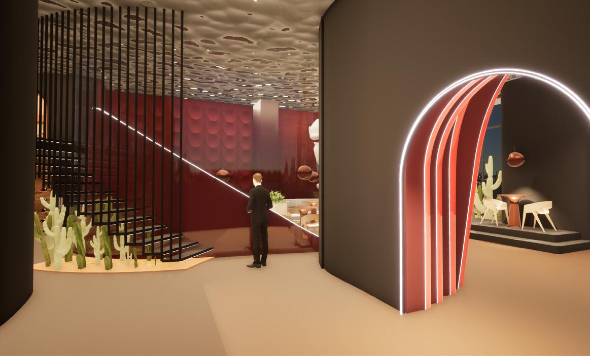 Embracing a fluid architecture, each component of the space, from walls to stairs, balustrades to ceilings, seamlessly transforms due to the adoption of new functionalities. The overarching concept teleports visitors to various global destinations, creating an immersive journey through the desert, by the ocean, within Arizona’s canyons, or even on the planet Mars. The space evokes vibrant and exotic emotions, conveying a sense of discovery and emotional resonance.