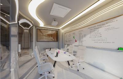 Within this mesmerizing space, a light high-tech style prevails, placing a spotlight on the pivotal role of lighting as a key design element. Distinct areas, including the office room, presentation room, main lobby, and meeting room, are artfully separated by unique parametric shapes, creating a fluid and dynamic spatial experience.