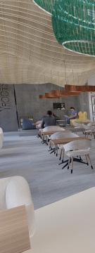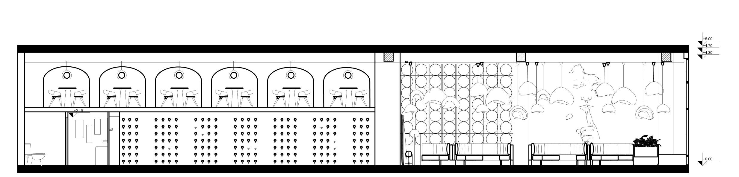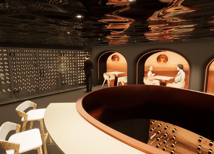A key feature of the space is its ad vantageous height, allowing for a spectacular scenography transfor mation. The absence of excessive architectural compartmentalization contributes to an open and adapt able environment, enabling distinct activities such as service, sales, wine storage, kitchen, and bar to coexist harmoniously. The innovative use of glass partitions enhances the sense of openness while strategically de marcating different zones.