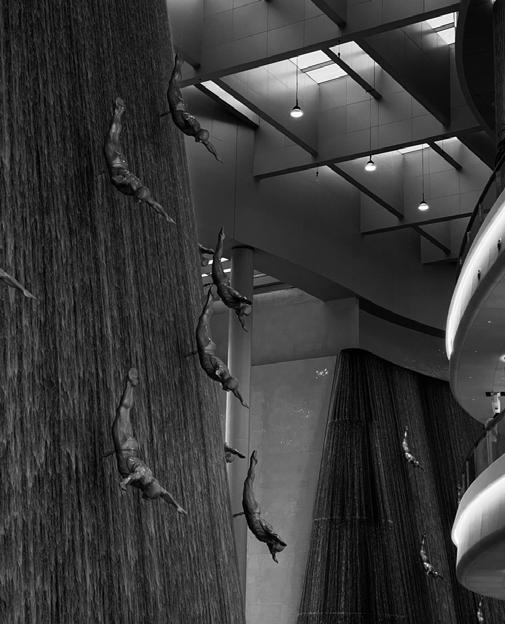 Strategically located in Victory Square with a generous east-facing facade, the building not only bathes in intense natural light during the first half of the day but also strategically positions itself for a bustling flow of people. The design palette revolves around foundational colors of brown, burgundy, black, gold, and bronze, while textures draw inspiration from the natural realm: canyon stone, water-imitating stainless steel, travertine, and onyx.
