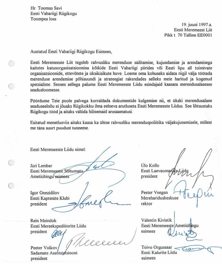 Meremehi esindavate organisatsioonidena oleme väga häiritud teatud huvigruppide võimekusest suruda Riigikogu tasemel läbi ning seadustada eelnõud, mis reguleerivad väga spetsiifilist ning neile sisult tundmatut valdkonda. Kõnesolevatel juhtudel puudutavad need otseselt suurt hulka igapäevaselt merel oma rasket tööd tegevaid kodanikke. Kõnesolevad ja vastu võetud seadusemuudastused annavad võimaluse kahjustada Eesti meremeeskonna huvisid, tekitavad küsitavusi meie meremeeste konventsionaalse diplomeerimise valdkonnas ning võivad olulisel määral kahjustada Eesti Vabariigi rahvusvahelist mainet antud valdkonnas. 1994.aastal Eesti lippu kandnud reisiparvlaeva hukkumise valguses on see aga meile ja riigile väga tundlik teema.