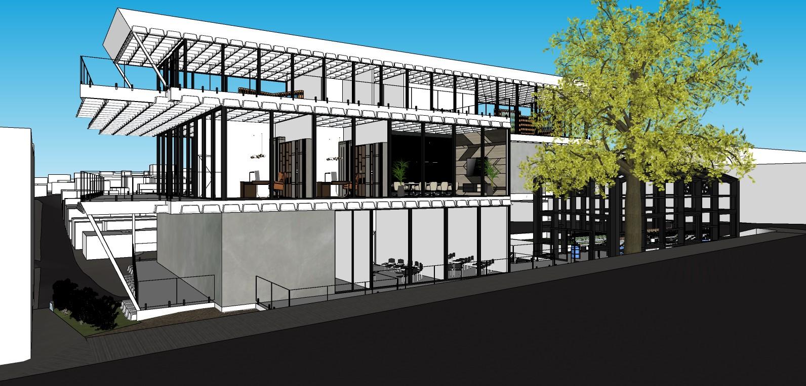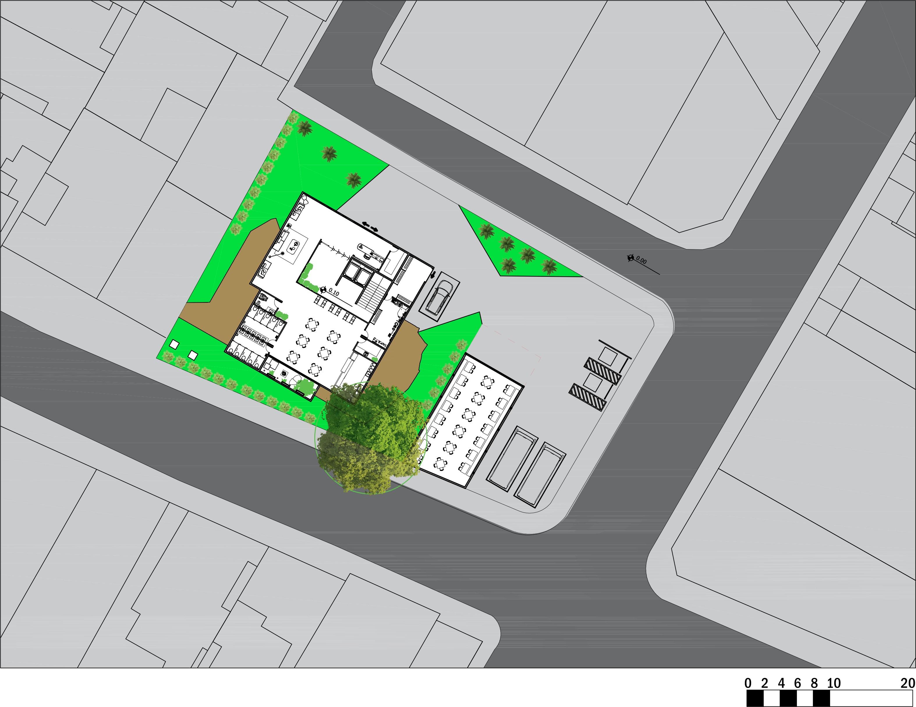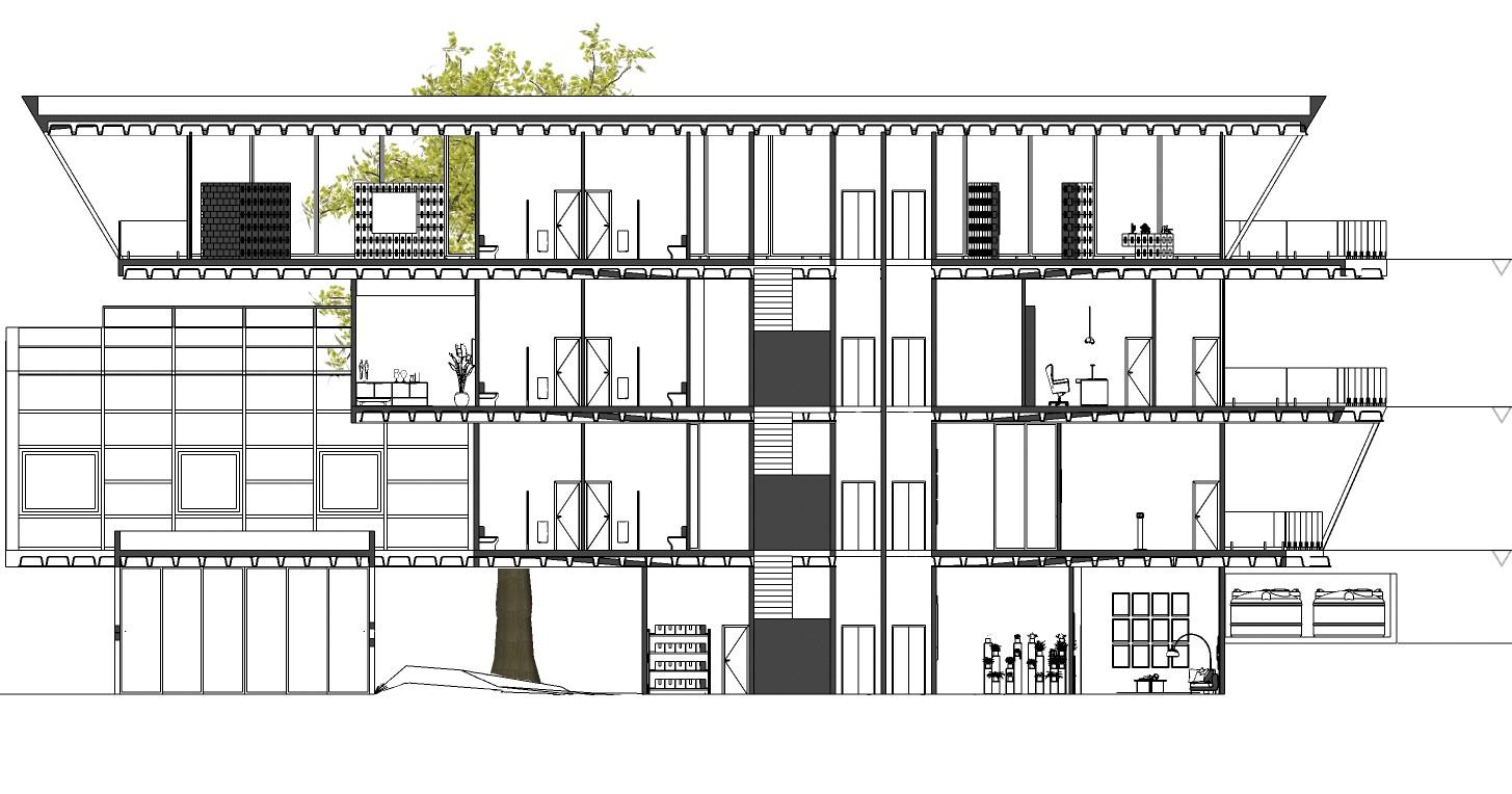 O projeto parte da ideia de manter a árvore de Ipê Roxo existente no terreno, fazendo assim sua integração com o Centro de