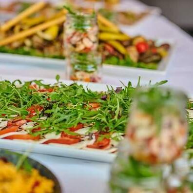 Salat von Kirschtomaten und Burrata auf Rucola, Couscoussalat mit Putenstreifen und Minze, Bruschetta mit frischen Kräutern, Tatar von der Bayerwaldforelle auf Pumpernickel, Mini Wiener Schnitzel auf Kartoffelsalat und Kronsbeeren, Gemüsestrudel auf Schnittlauchschmand, Asia Rinderspieß mit Teriyakisoße