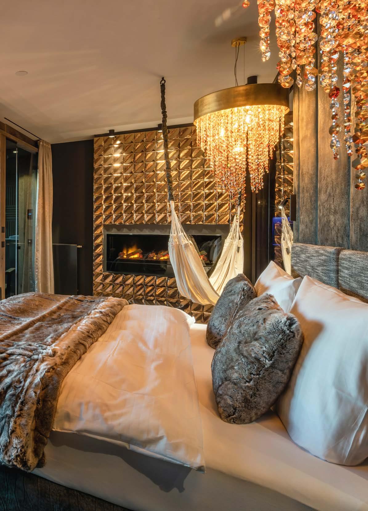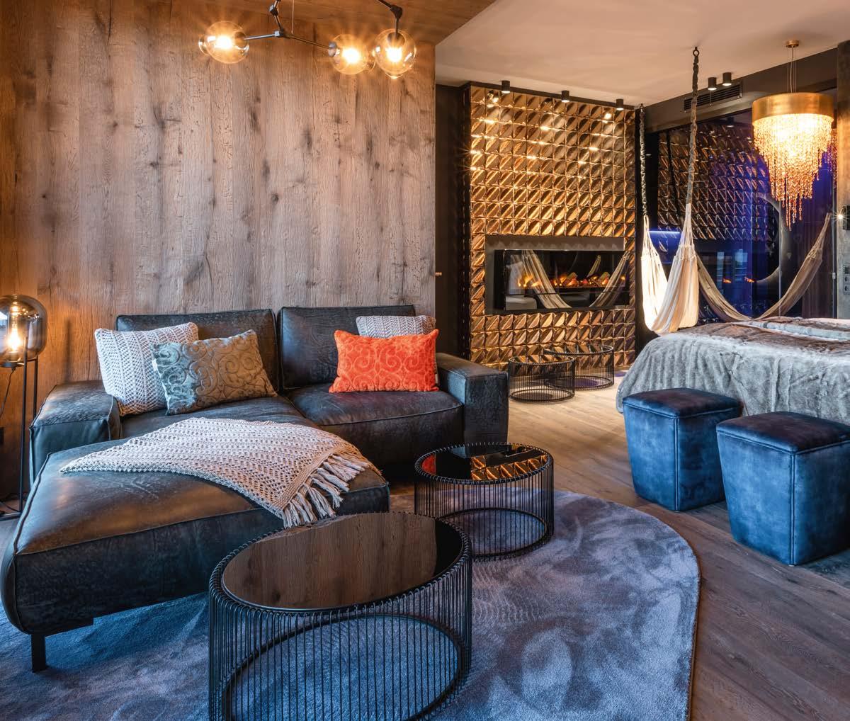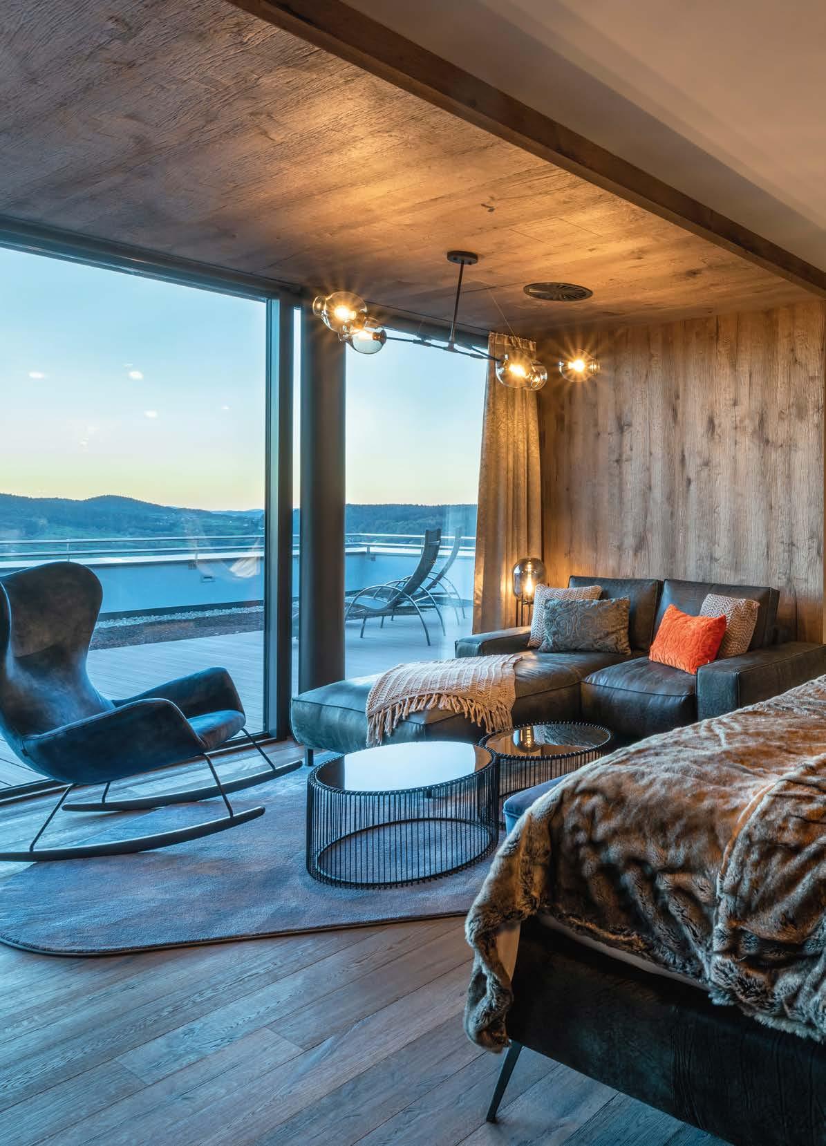 In diesem Wohlfühlzimmer lädt das Himmelbett (200 x 200cm) und das gemütliche und luxuriöse Ambiente zu unvergesslichen Wohlfühlmomenten ein. Dank Whisper-Airpool und Panoramasauna auf der Süd-Loggia haben Sie einen eigenen, kleinen Wellnessbereich mit atemberaubendem Ausblick.