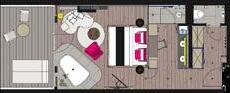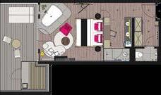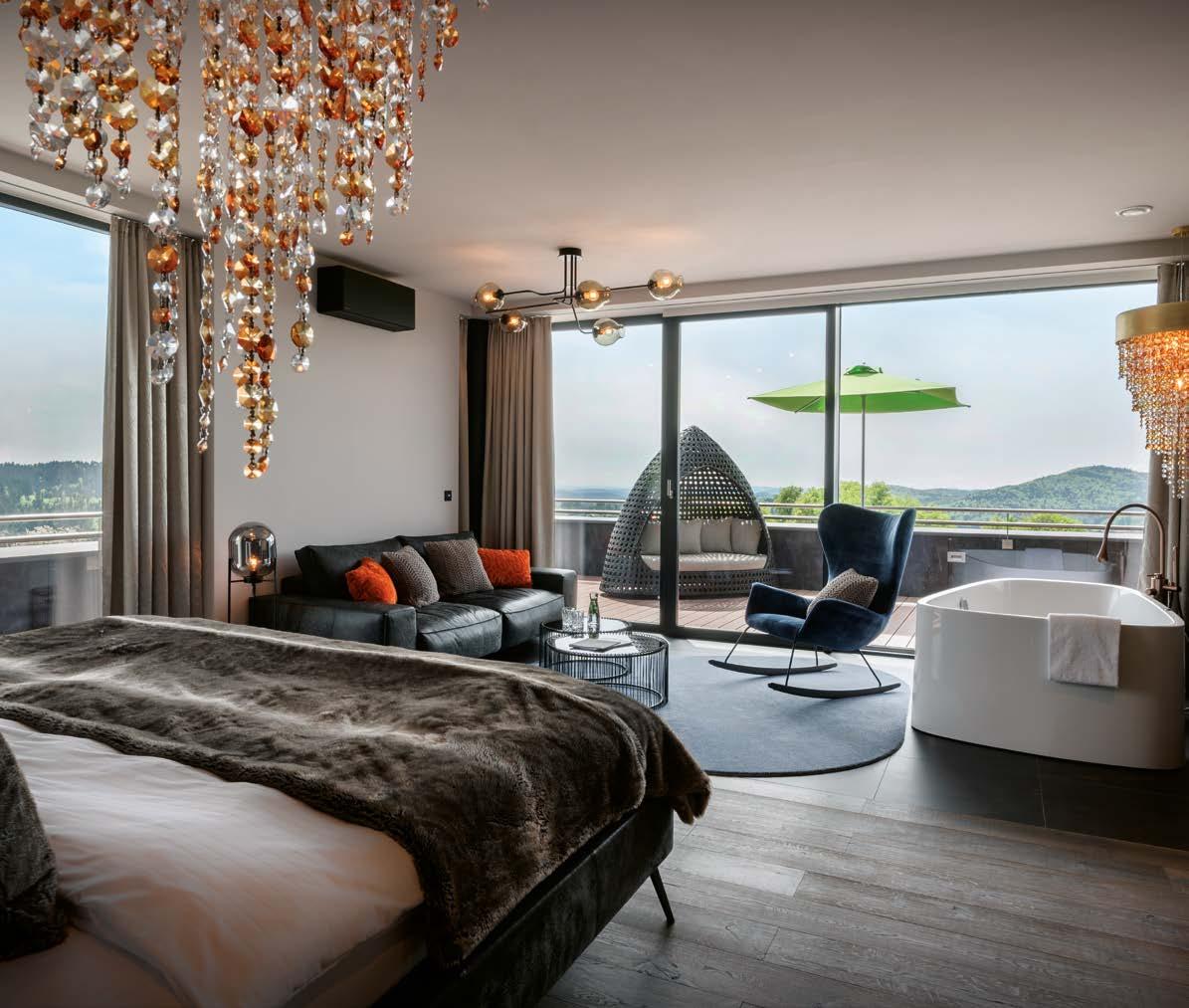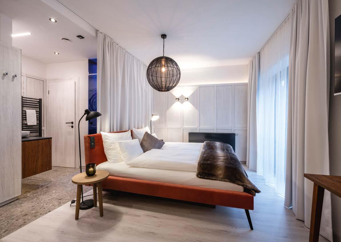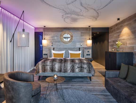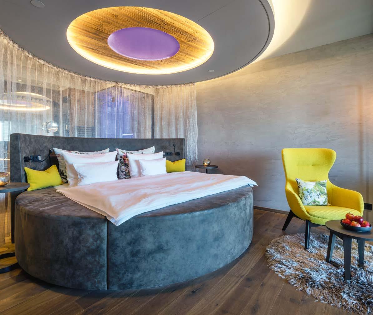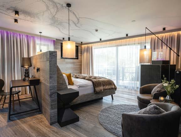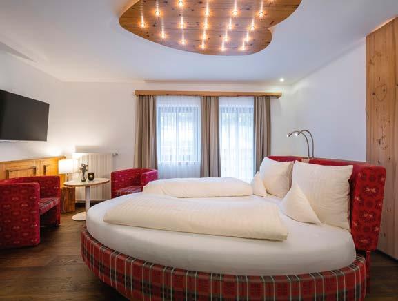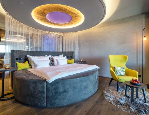 Ziehen Sie sich zurück in ein traumhaftes Zimmer mit Kuschelbett (180 x 200cm) und offenem Bad, umrahmt von hochwertigen Stoffen und edlen Farben. Entspannen Sie im eigenen Whisper-Airpool, der Leuchtkristall sorgt für eine romantische Stimmung. Fangen Sie die Sonnenstrahlen auf Ihrer Süd-Loggia ein und genießen Sie die Auszeit zu zweit.