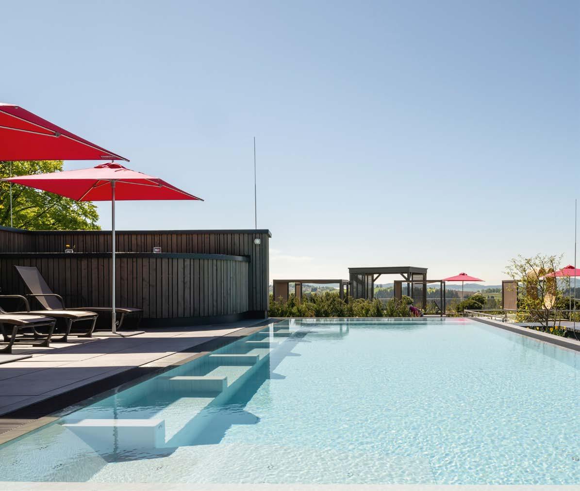 Erleben Sie ein grenzenloses Gefühl mit herrlichem Ausblick aus unserem Infinitypool. Bei 33,5°C steht dem Badevergnügen nichts mehr im Weg. Ob entspannt auf den Whirl-Liegen die Aussicht genießen oder seine täglichen Bahnen ziehen. Hier findet man die perfekte