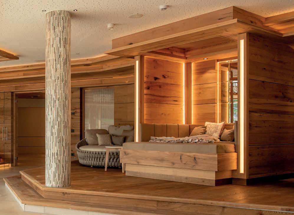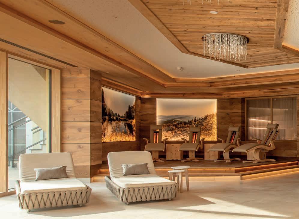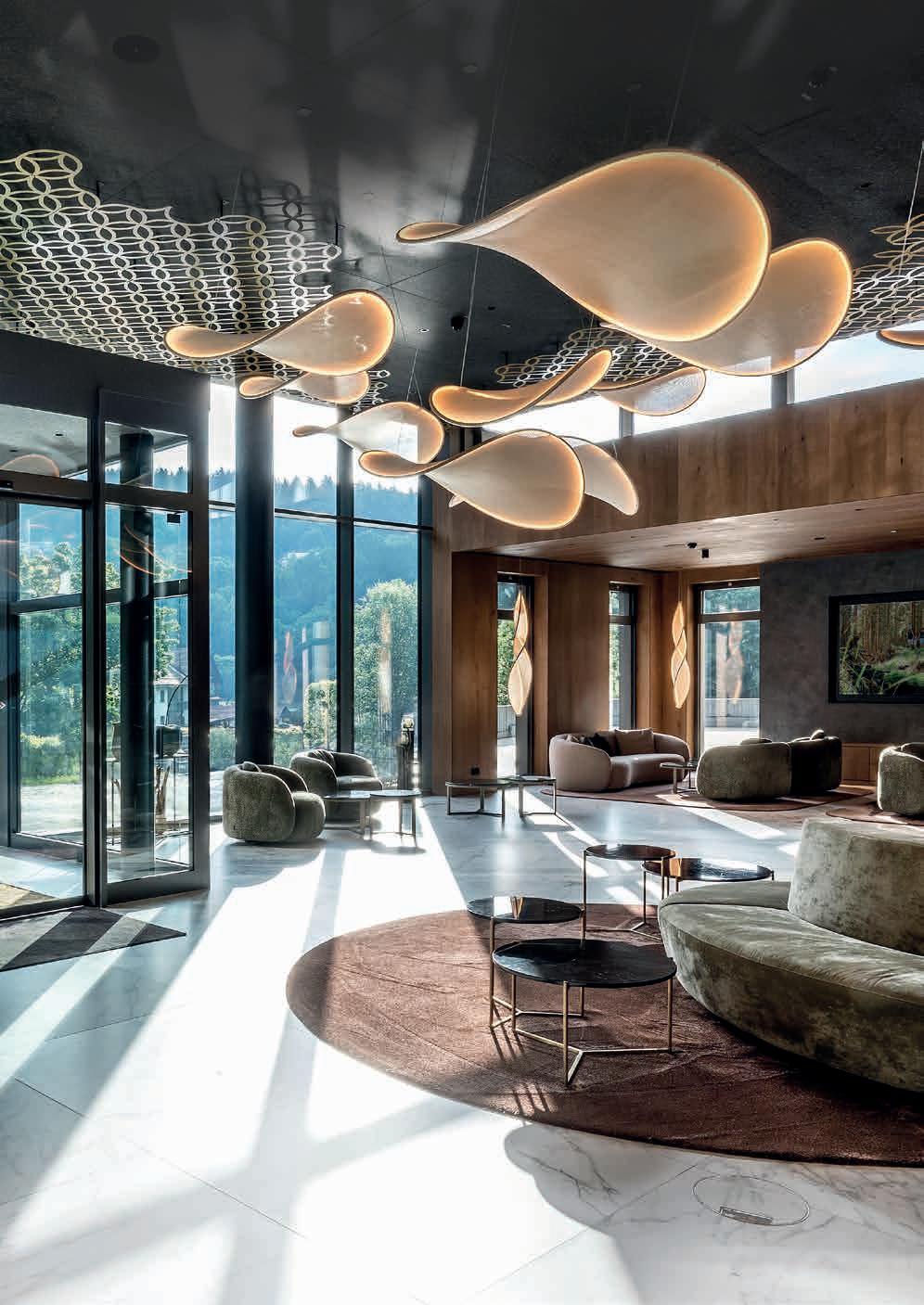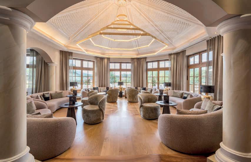 Im neu gestalteten Loungebereich entfaltet sich die neue Ästhetik des Mooshof – weich in der Form, warm im Ton und großzügig im Raumgefühl. Die Sofalounge mit ihrem hellen Licht und den eleganten Rundungen strahlt Offenheit aus – ein Ort für Gespräche, für gemeinsames Verweilen, für Leichtigkeit. Ein besonderes Highlight ist der große Deckenleuchter – filigran und doch präsent, er taucht den Raum in sanften Glanz.
