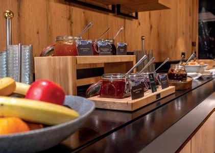 Am Morgen erwartet die Gäste ein reichhaltiges Frühstücksbuffet mit frischem Gebäck, regionalen Spezialitäten, saisonalem Obst, hochwertigen Milchprodukten – begleitet von frisch gepressten Säften und Kaffeespezialitäten. Die Eiergerichte werden an der Front-Cooking-Station ganz nach Wunsch zubereitet. Wer es lieber herzhaft mag, findet auch deftige Frühstücksvarianten mit würzigem Speck, regionaler Wurst und Fischvarianten.