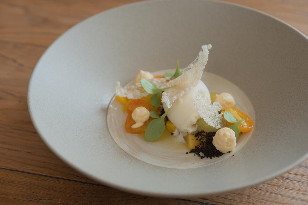 “Orangen-Schokoladenkiste 2.0“ Luftiges Jaffa-Orangenmousse mit gekühlter Orangenjus und dunklem Schokoladenrahmeis