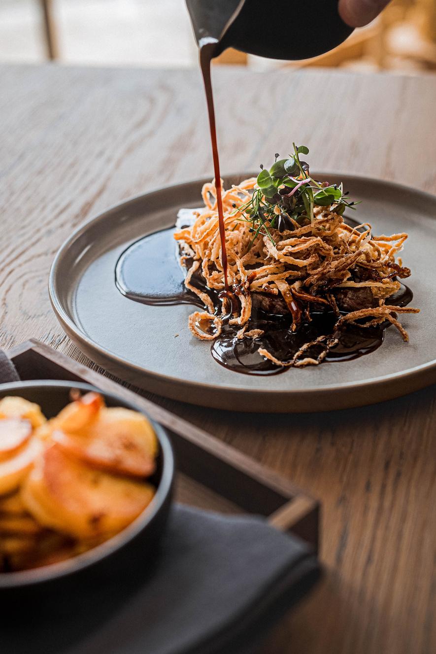 Rumpsteak von Simmentaler Rind mit reduzierter Schmorjus, Cafè de Paris Butter dazu junges Gemüse & Kartoffel-Baggers