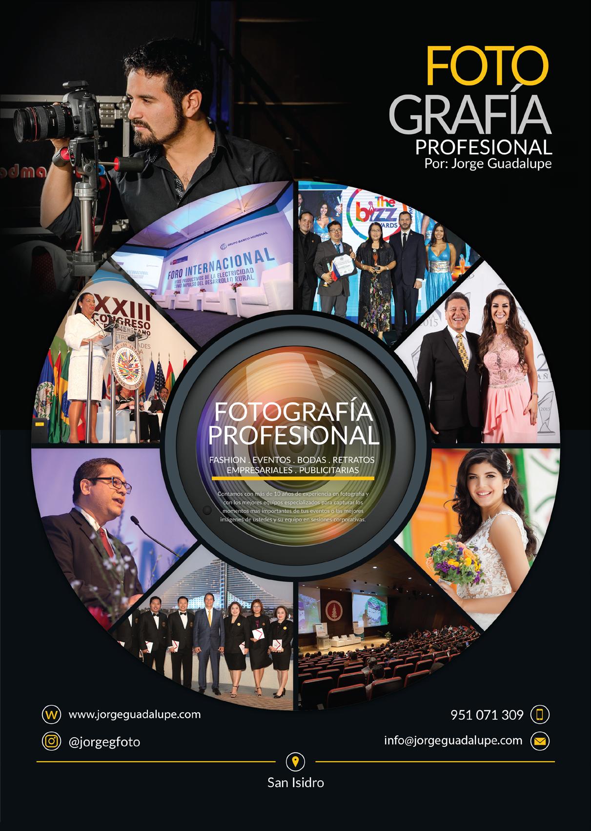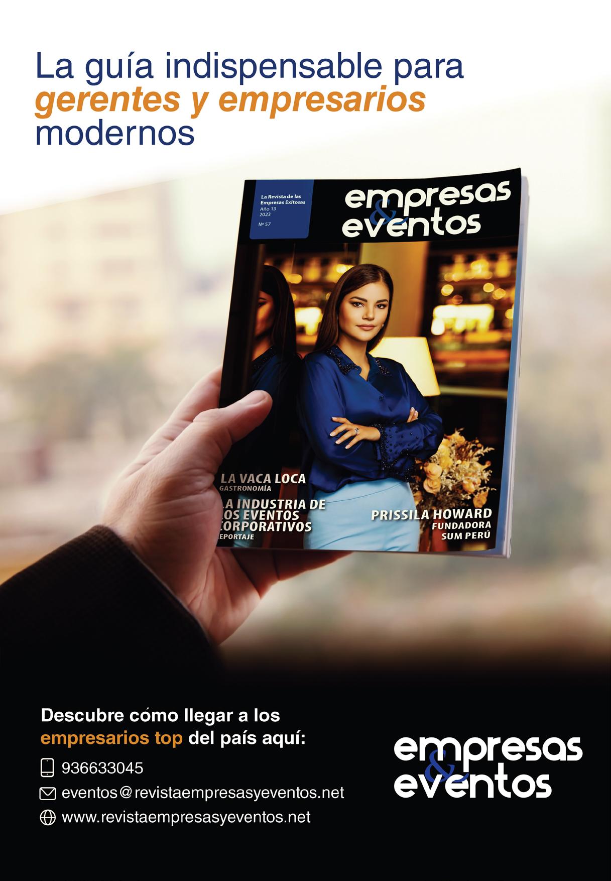 Dirección: Blamy Morán blamy@revistaempresasyeventos.net / Editora: Camila Hurtado editora@ revistaempresasyeventos.net / Coordinación de Edición y Redacción: Zoraida Gutiérrez / Colaboradores: José Carreras, Luis Kiser, Julio Chirinos, Juan Carlos Orosco, Walter Muñoz / Diseño y diagramación: Jorge Guadalupe / Fotografía y dirección de arte: Jorge Guadalupe / Community Manager: Naomi Castro / Asistente de edición: Damaris Sosa / Impresión: Industria Gráfica Cimagraf S.A.C / Contacto y Publicidad: 936 633 045 eventos@revistaempresasyeventos.net