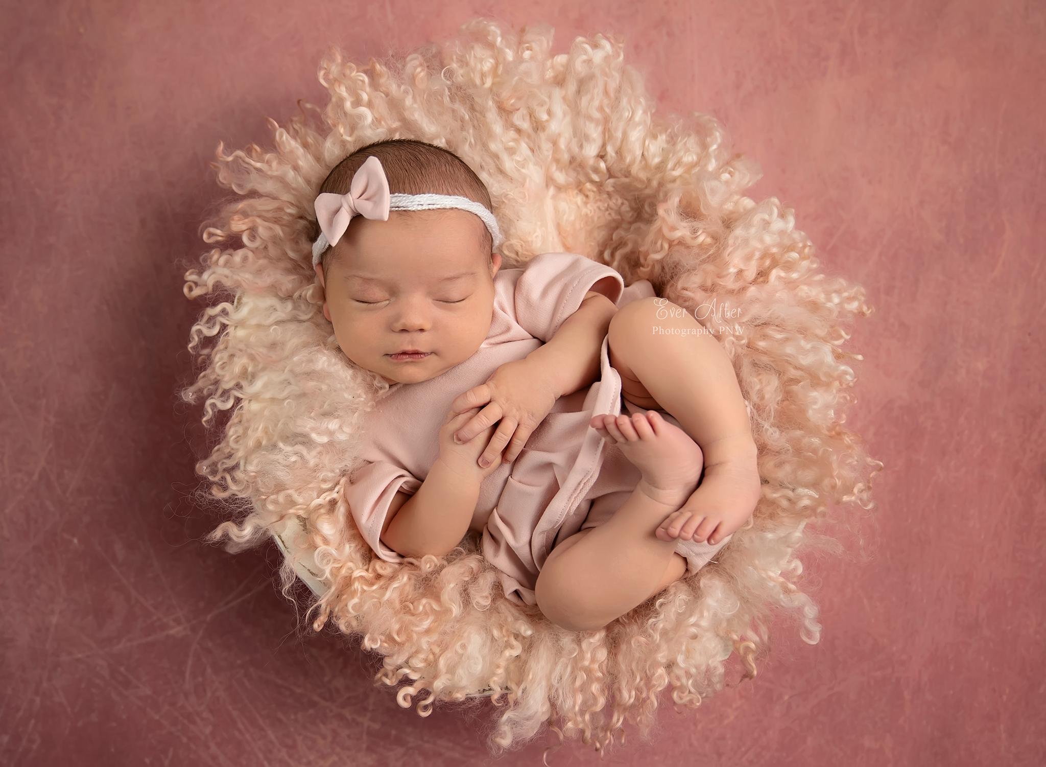 We’ll undress baby down to their diaper, then give you time to feed again before we start. This helps settle baby into that sleepy state we need for posing.