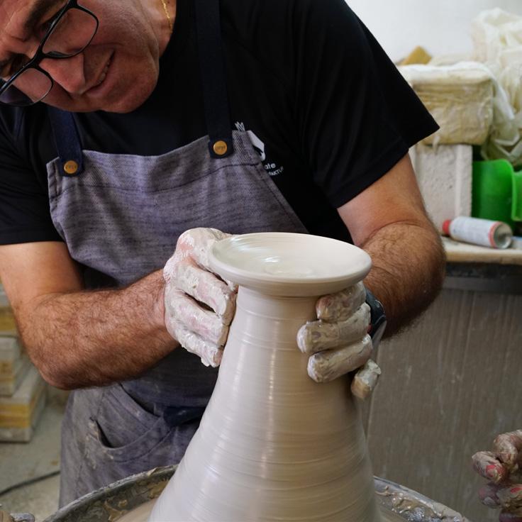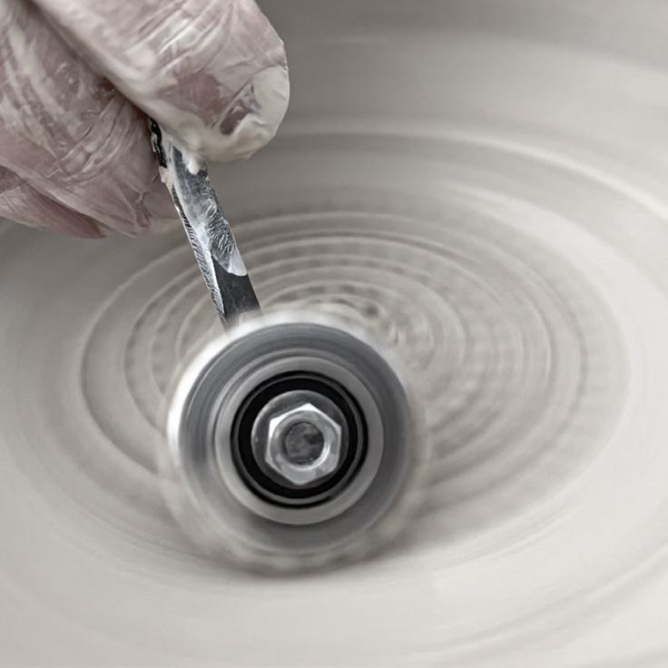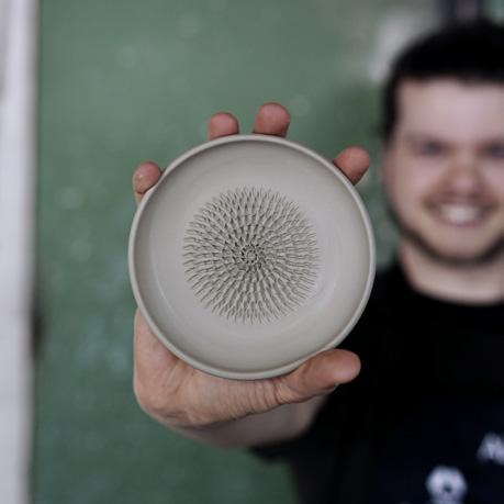 Nach der Formung des Tons wird mit dem eigens entworfenenen Spezialwerkzeug und sehr viel Feingefühl die einzigartige Reibstruktur gerädelt.