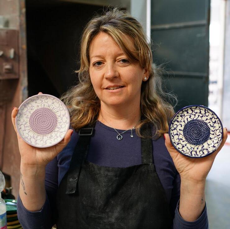 Anschließend wird die Glasur aufgetragen und durch den Glattbrand geschmolzen. Jetzt entfaltet die aufgebrachte Bemalung ihre volle Intensität und Leuchtkraft unter einer glatten, glasharten Oberfläche.