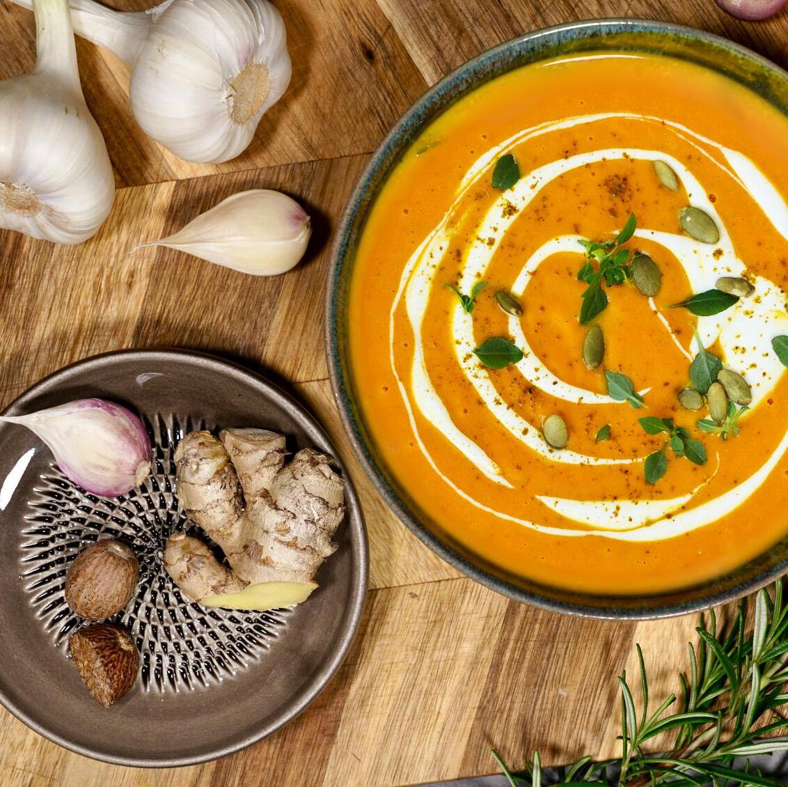 Zum Servieren mit etwas Kokosmilch und frischen Kräutern, z.B. Koriander und gerösteten Kürbiskernen garnieren.
