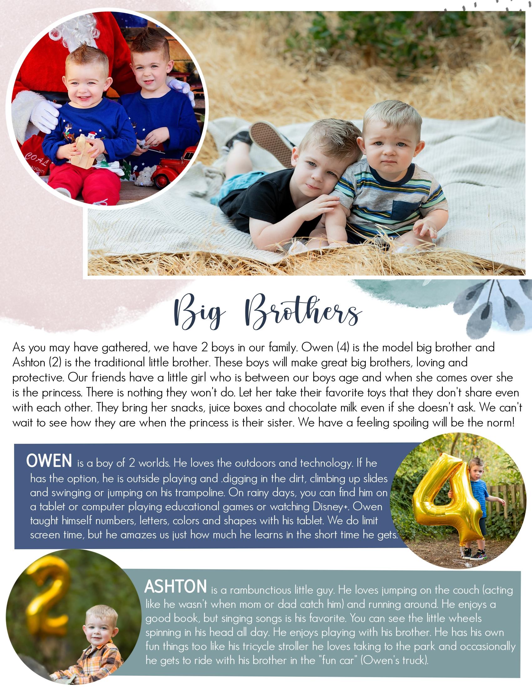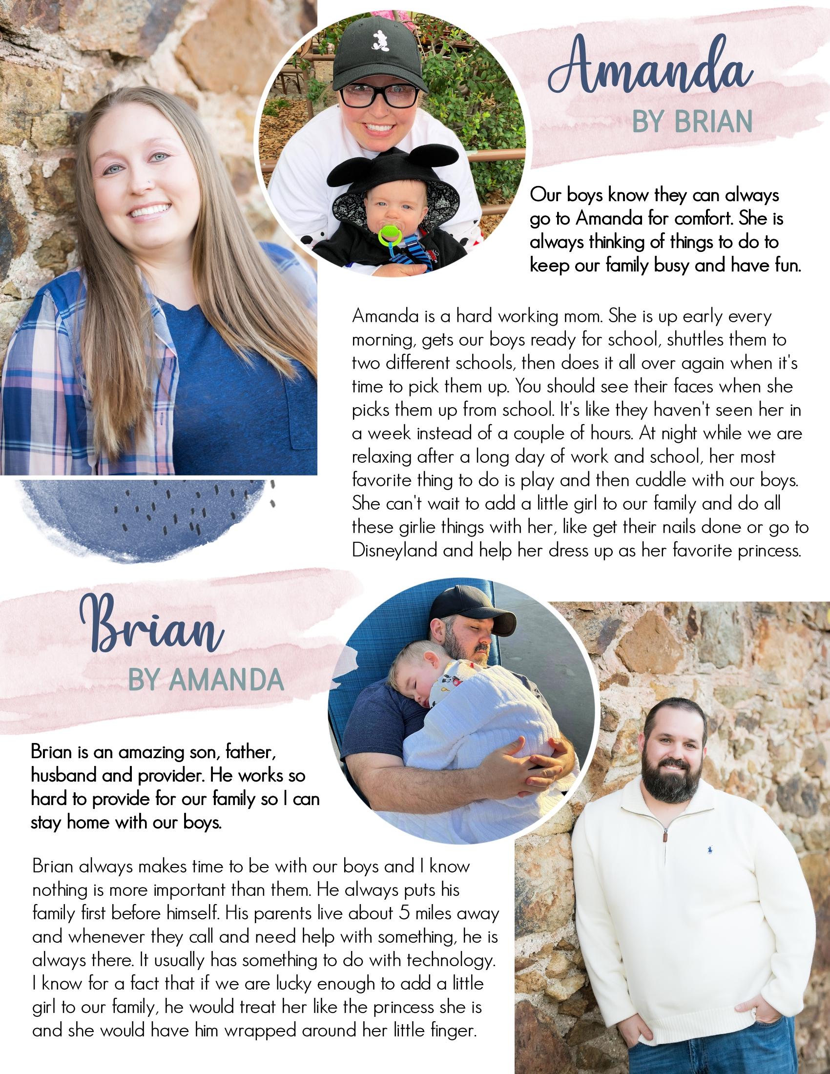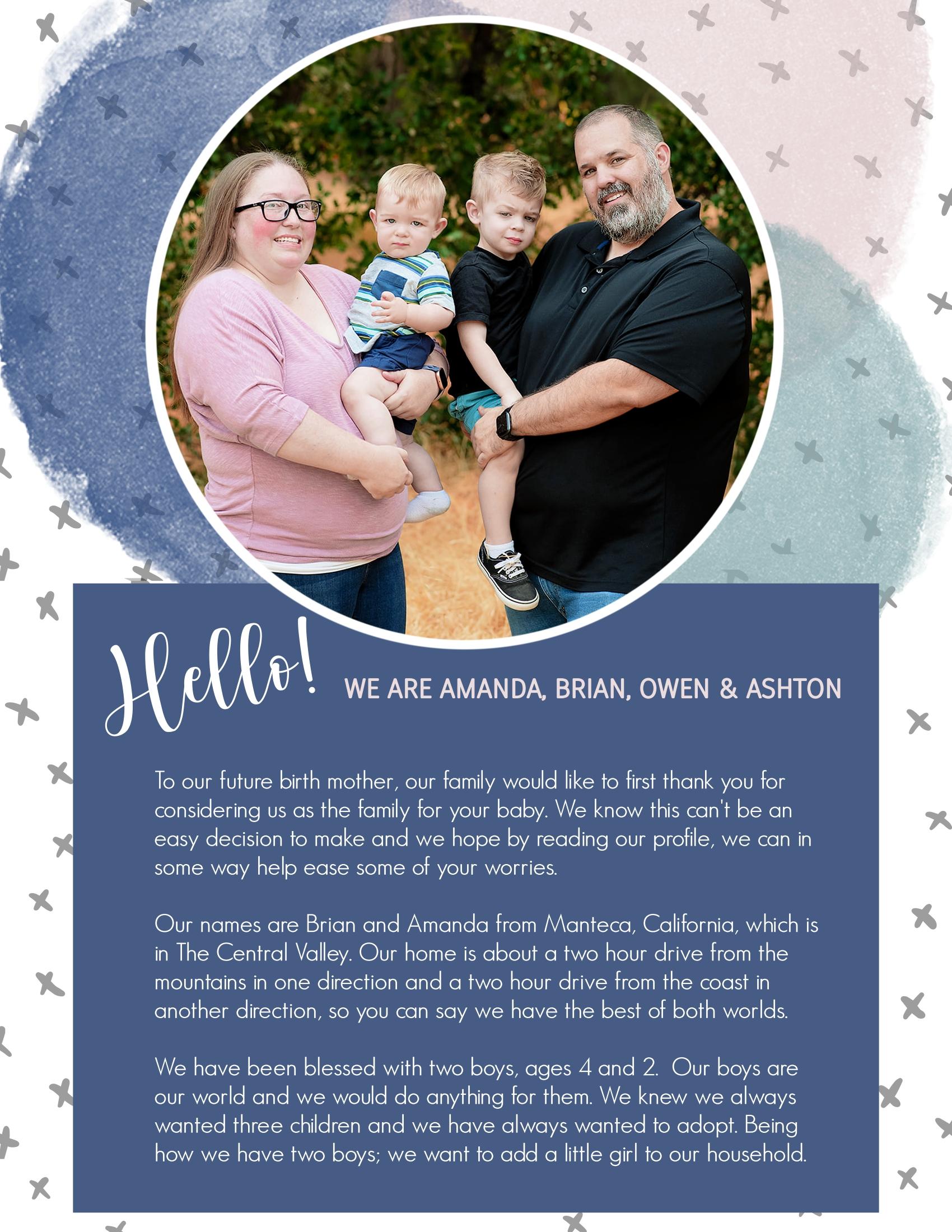 "Our names are Brian and Amanda from Manteca, California, which is in The Central Valley. Our home is about a two hour drive from the mountains in one direction and a two hour drive from the coast in another direction, so you can say we have the best of both worlds. We have been blessed with two boys, ages 4 and 2. Our boys are our world and we would do anything for them. We knew we always wanted three children and we have always wanted to adopt. Being how we have two boys; we want to add a little girl to our household." www.everlastingadoptions.com