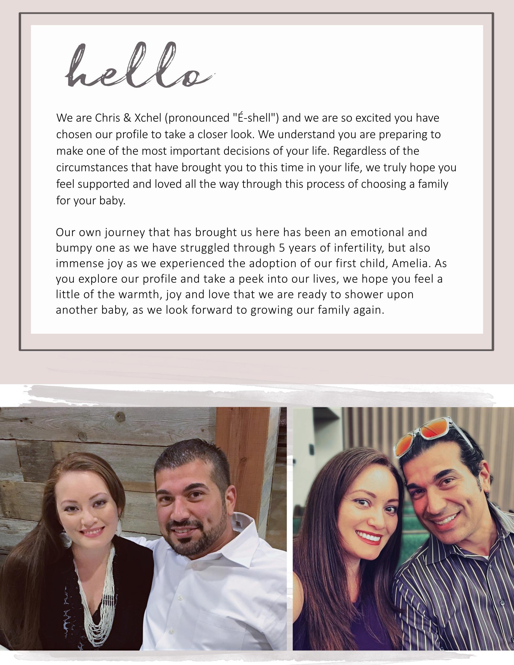 Hello, we are Chris and Xchel (pronounced “É-shell”) and we are so excited you have chosen our profile to take a closer look. We understand you are preparing to make one of the most important decisions of your life. Regardless of the circumstances that have brought you to this time in your life, we truly hope you feel supported and loved all the way through this process of choosing a family for your baby. Our own journey that has brought us here has been an emotional and bumpy one as we have struggled through 5 years of infertility, but also immense joy as we experienced the adoption of our first child, Amelia. As you explore our profile and take a peek into our lives, we hope you feel a little of the warmth, joy and love that we are ready to shower upon another baby." View our full profile at https://everlastingadoptions.com/waiting-families/xchel-chris/