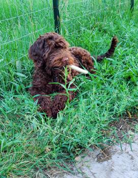 We have one dog, named Sailor. She is a Portuguese Water dog Sailor is still a puppy and is making progress in her training. She loves kids and does really well with our nieces and nephews. Sailor is sassy but friendly She loves meeting new people and dogs, and wants everyone to be her friend.