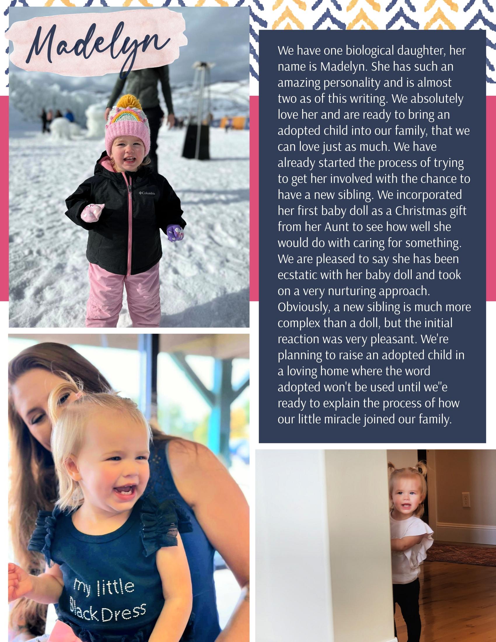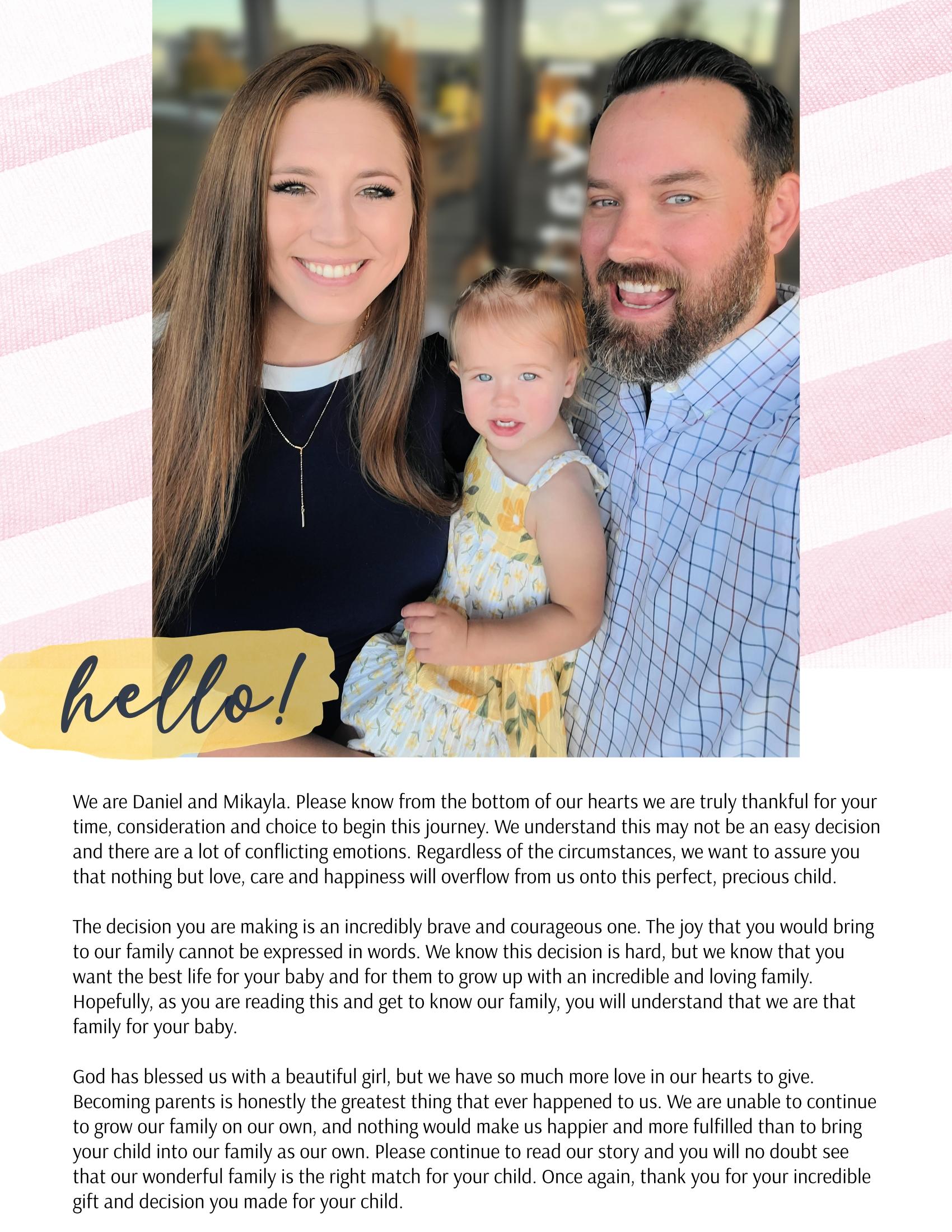 "God has blessed us with a beautiful girl, but we have so much more love in our hearts to give. Becoming parents is honestly the greatest thing that ever happened to us. We are unable to continue to grow our family on our own, and nothing would make us happier and more fulfilled than to bring your child into our family as our own. Please continue to read our story and you will no doubt see that our wonderful family is the right match for your child. Once again, thank you for your incredible gift and decision you made for your child." www.everlastingadoptions.com