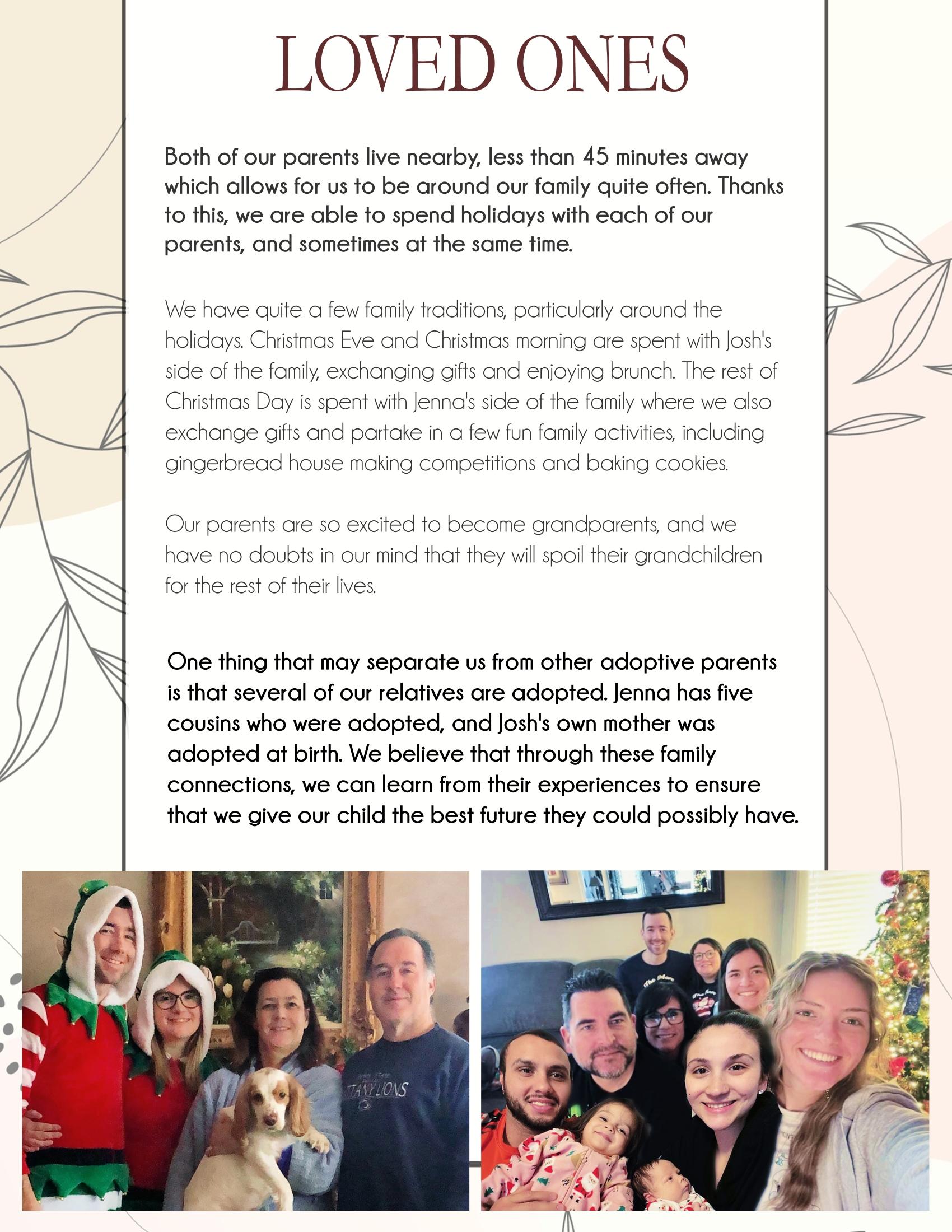 "Thank you for considering us to adopt your bundle of joy. We are Josh and Jenna and we live in Pennsylvania. We are so excited to become first time parents and provide the best life to our child. We have known that we wanted to adopt for the past five years and have been planning for this baby for the past few years. We are financially stable and have started planning for the baby's financial future, so we can cover all college or trade school costs. We will love this baby with all of our hearts. We have a large extended family who cannot wait to love our baby too."