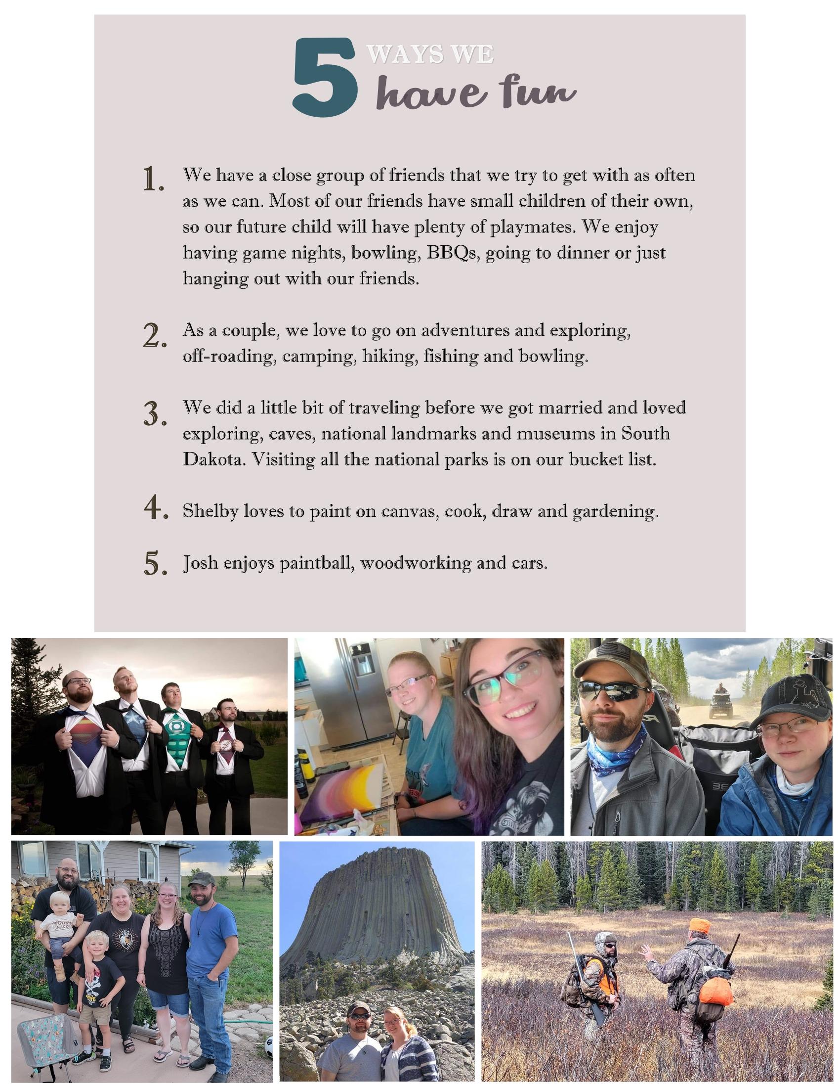 "Let me introduce ourselves; we are Shelby and Josh. Adoption has always been in the back of our minds. After many failed pregnancies and finding out that Shelby will never be able to carry past 12 weeks, we decided we would love to take the journey of starting a family through adoption. Know that if you choose us, your child will be growing up in a loving, protective and caring family."