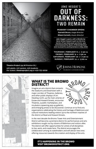 THURSDAY, FEBRUARY 8 AT 7:30 PM FRIDAY, FEBRUARY 9 AT 7:30 PM SATURDAY, FEBRUARY 10 AT 7:30 PM SUNDAY, FEBRUARY 11 AT 3:00 PM Theatre Project (45 W Preston St.) $25 adults, $15 seniors, $10 students For tickets: theatreproject.org or 410-752-8558