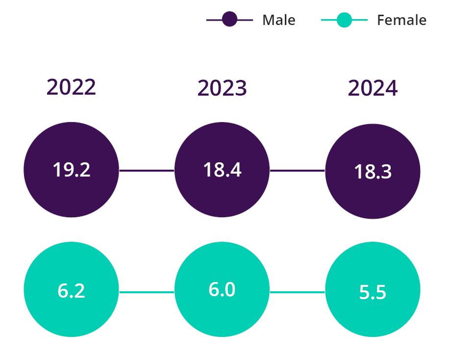 • Though 2024 suicide data is considered preliminary, suicide rates for males and persons living in remote and very remote Australia are the highest in the five-year time-series.