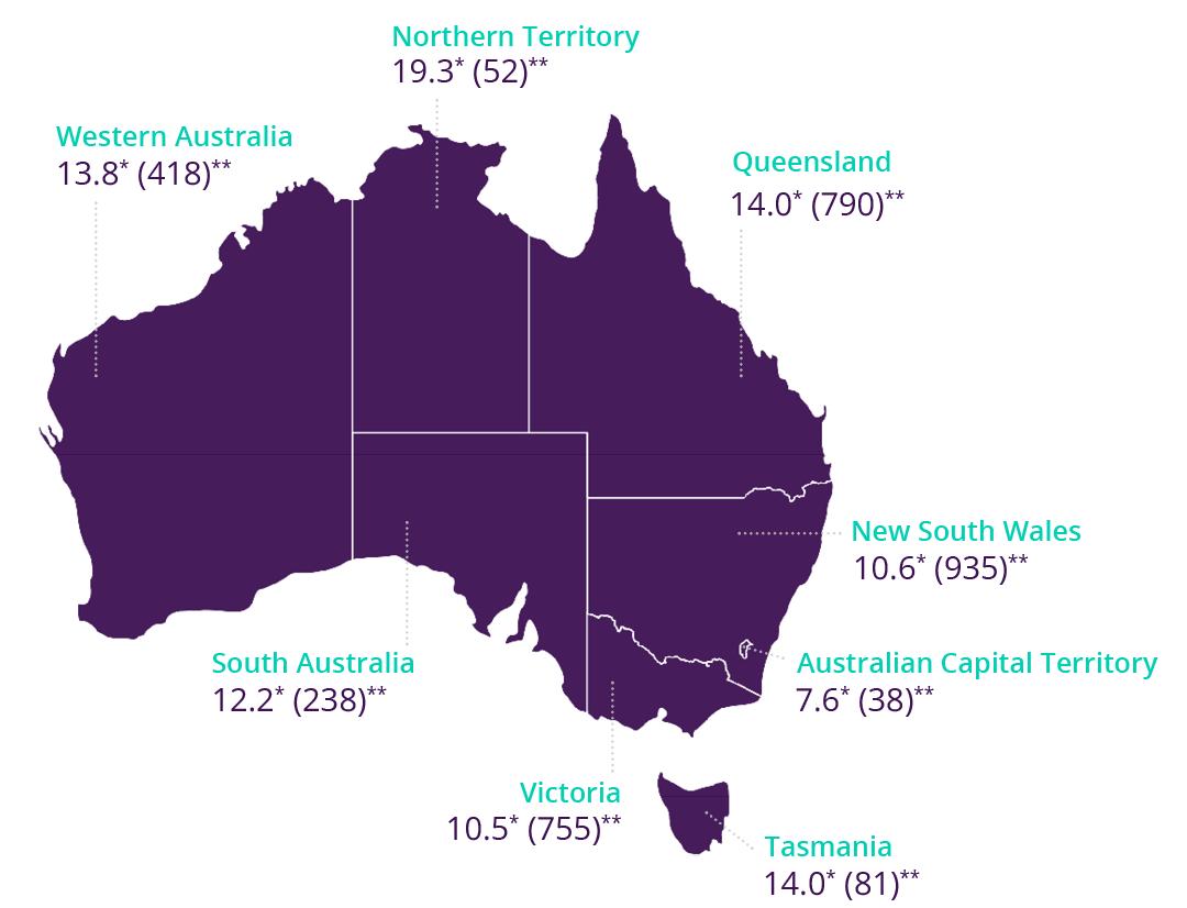 • Due to the relatively small population size in some states and territories, even one or two deaths can have a significant impact on state-specific age-standardised suicide rates. Therefore, comparisons across Australia must be done with caution