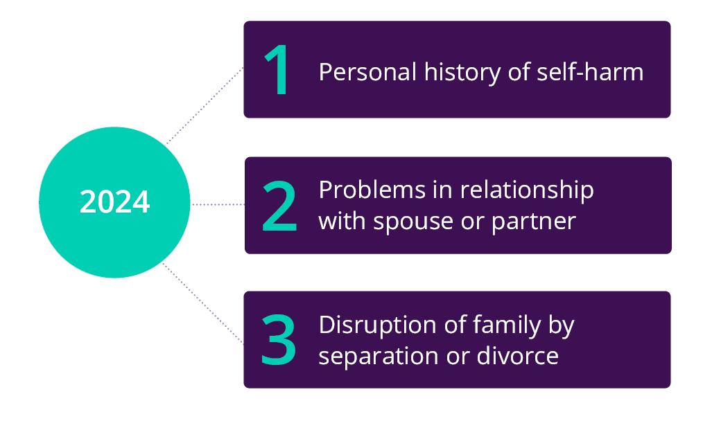 • In 2024, 79.7% of people who died by suicide had at least one risk factor reported, with an average of four factors mentioned.