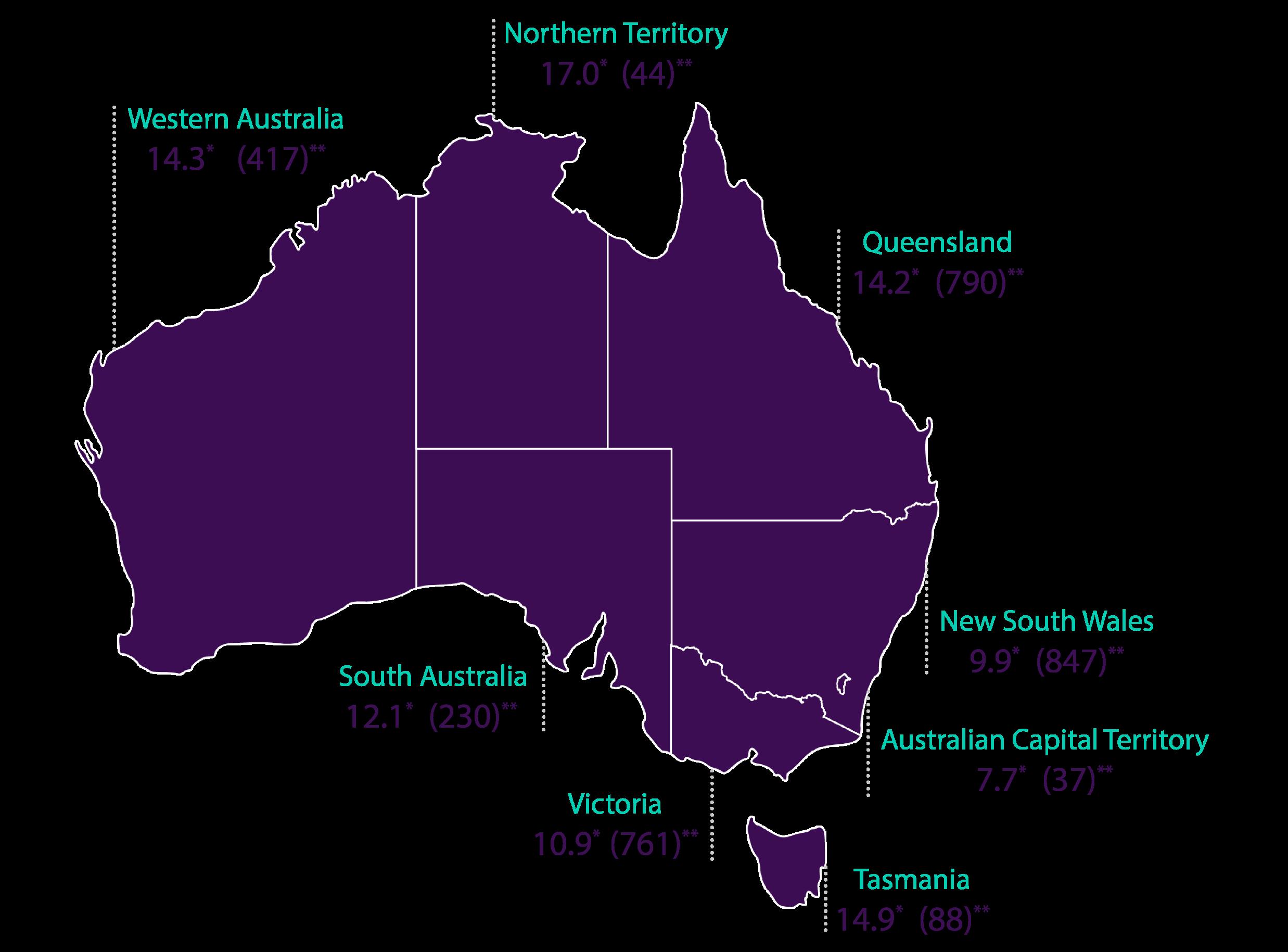 • Western Australia recorded the nation’s third highest age-standardised suicide rate (14.3 per 100,000).