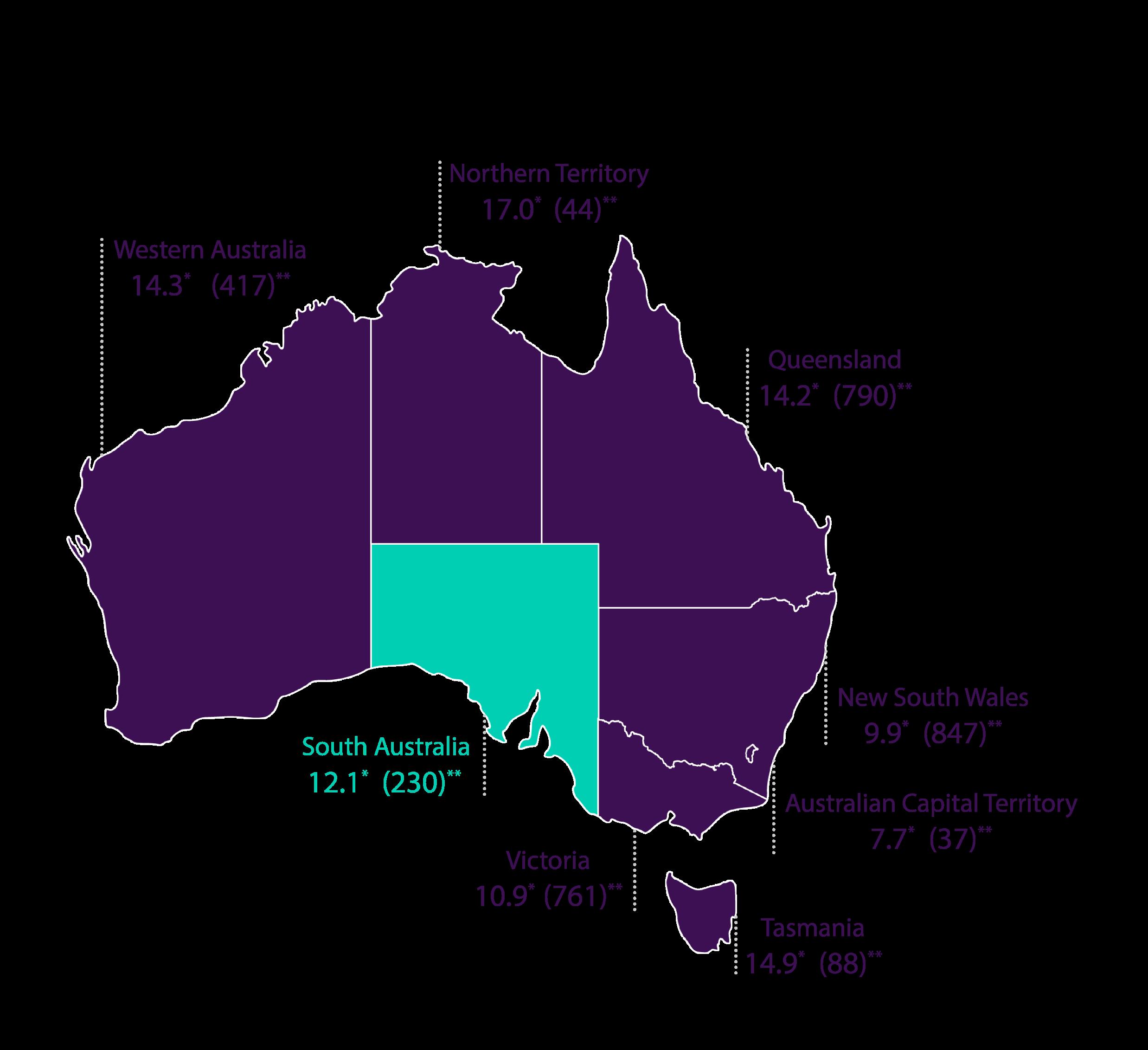 • South Australia recorded the nation’s fourth lowest age-standardised suicide rate (12.1 per 100,000).