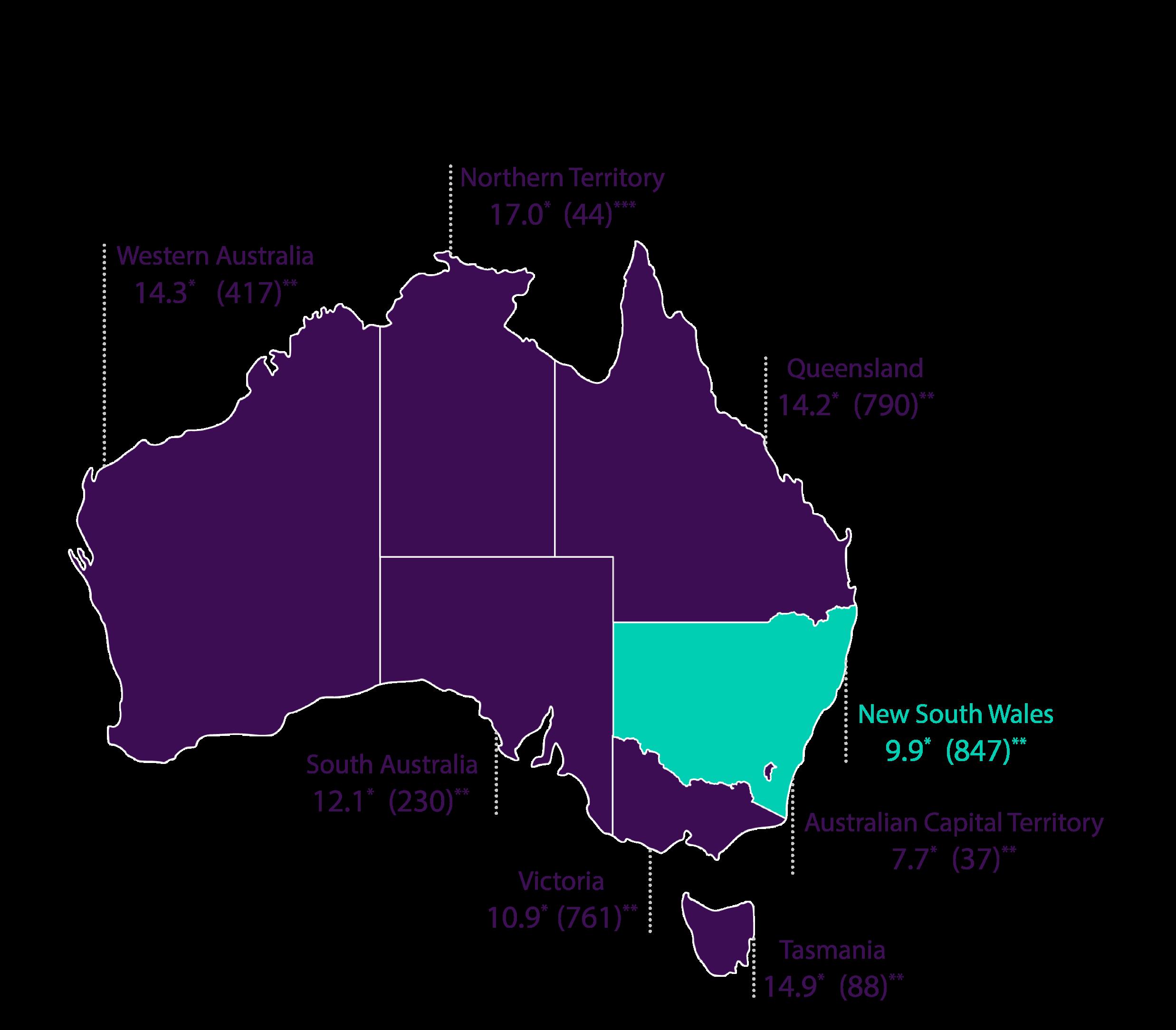 • New South Wales recorded a preliminary agestandardised suicide rate (9.9 per 100,000).