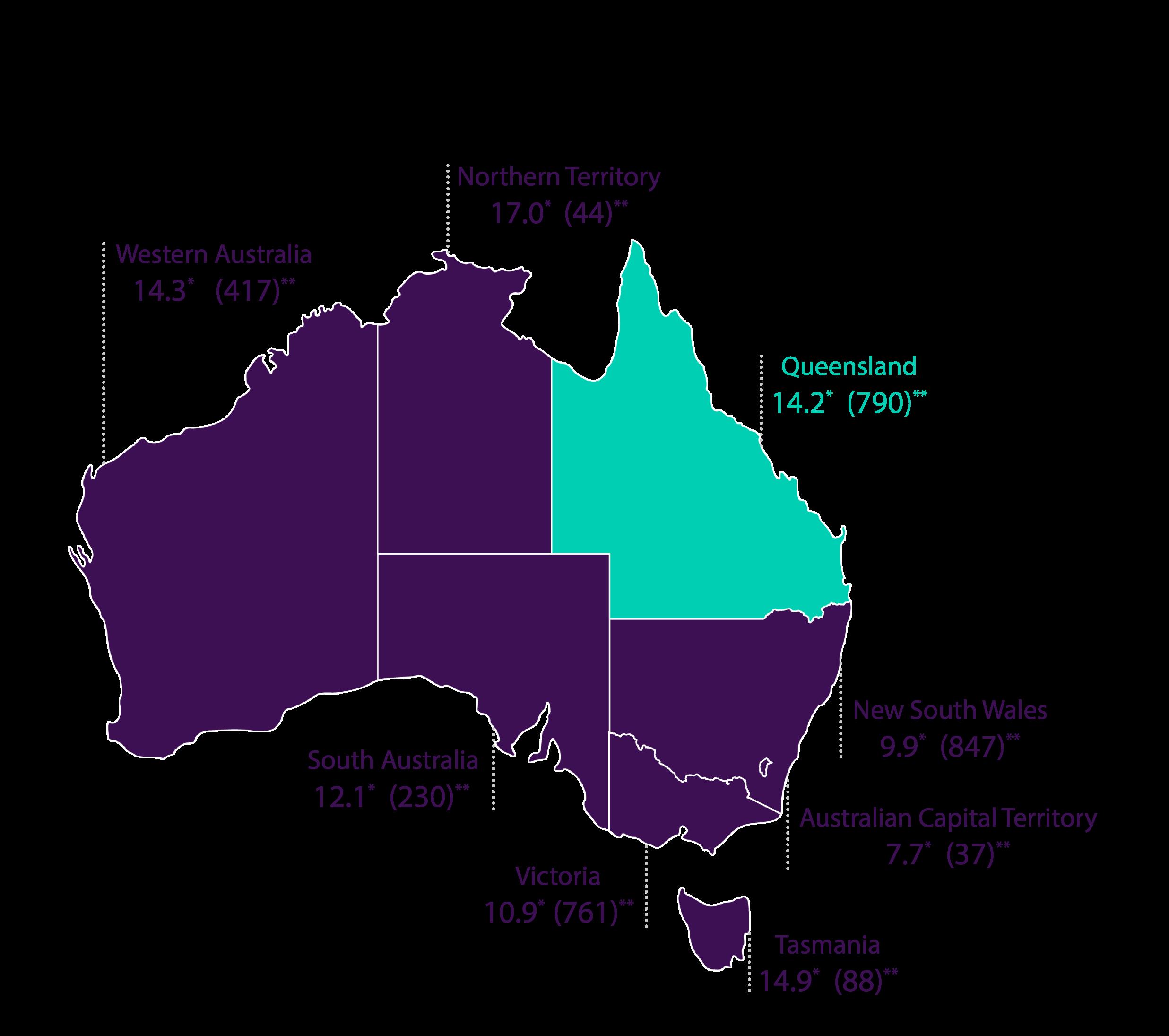 • Queensland recorded the Nation’s fourth highest age-standardised suicide rate (14.2 per 100,000).