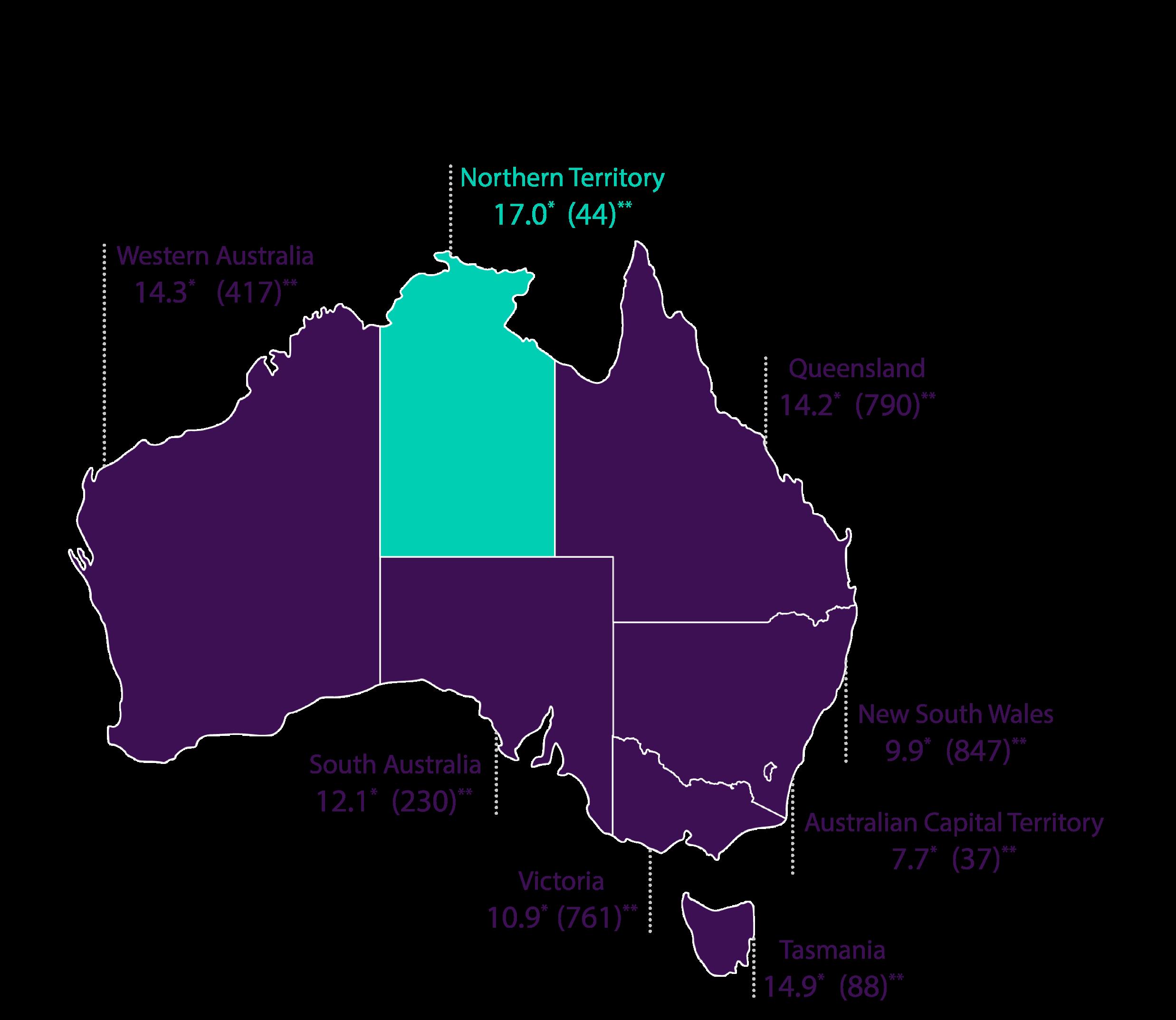 • The Northern Territory recorded the nation’s highest age-standardised suicide rate (17.0 per 100,000).