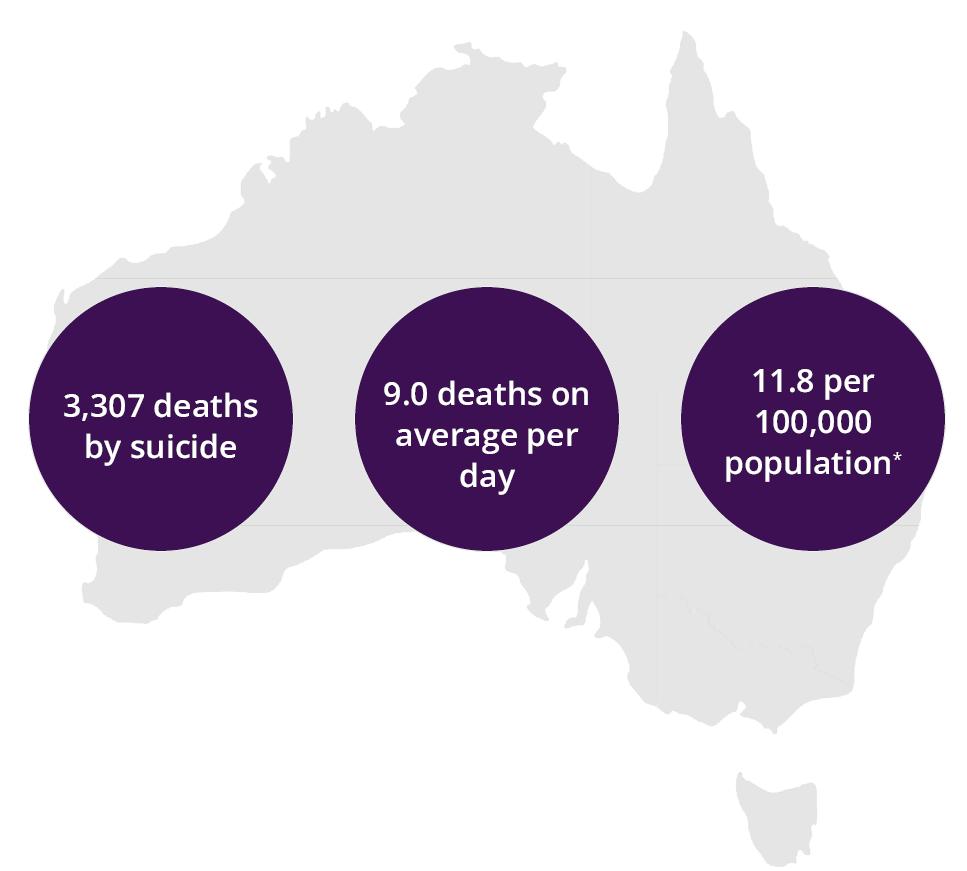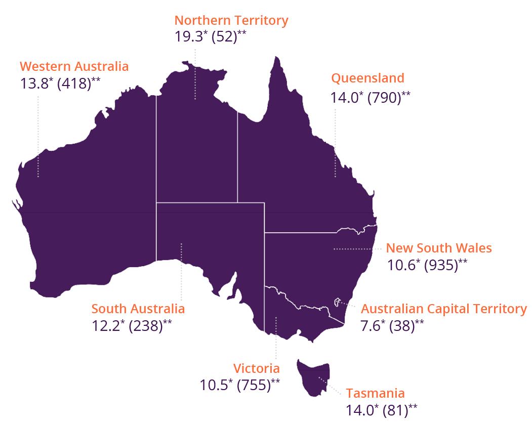 • Northern Territory recorded the highest suicide rate (19.3 per 100,000).