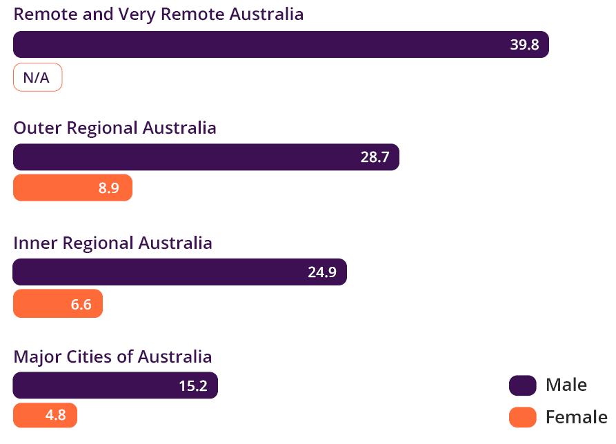• In 2024, the suicide rate for males living in remote and very remote Australia (39.8 per 100,000) was more than double the rate for males living in major cities (15.2 per 100,000).