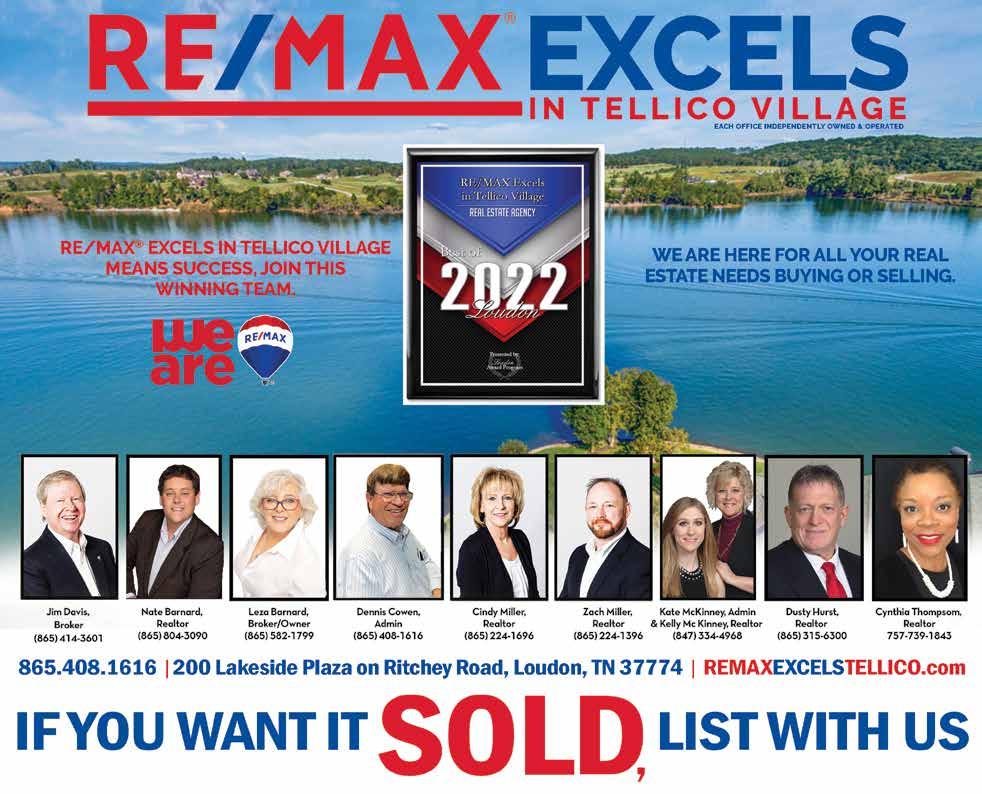 December, 2022, East Tennessee’s Mountain Views • 3A 9+ Lightly Restricted Acres 25998 E Watkins Rd Loudon, $249,000 Zach Miller, 865-408-1616 Lake Access with Deeded Boat Slip! 408 Wood Duck Lane Loudon, $129,000 Zach Miller, 865-408-1616 Newly Remodeled Basement Ranch 1004 Durmast Drive Knoxville, $213,000 Dusty Hurst, 865-315-6300 Convenient location with a very private wooded yard. 108 Oostanali Way Loudon, $595,000 Jim Davis, 865-414-3601 Great building lot - .64 Acres. Totally unrestricted Boling Rd Rocky Top, $12,000 Cindy Nash Miller, 865-224-1696 4 Br/3.5 Ba. Townhouse in Desirable Tanasi Lagoon, Updated, Newer roof 192 Tanasi Lagoon Loudon, $699,900 Leza Barnard 865-582-1799, Nate Barnard 865- 804-3090 Toqua Charmer. Serene setting with seasonal lakes views. 110 Saligugi Way Loudon, $555,000 Leza Barnard, 865-582-1799 BRAND NEW, open-concept home on .5 UNRESTRICTED, WOODED acre. 148 Stinnett Ridge Rd Madisonville, $219,630 Kelly McKinney, 847-334-4968 LOCATION! LOCATION! LOCATION! Rare Opportunity! 3.56 Acres Oakvale Drive Knoxville, $225,000 Cindy Nash Miller, 865-224-1696 7+ Lightly Restricted Acres 25998 E Watkins Rd Loudon, $234,000 Zach Miller, 865-408-1616 LARGE mostly level building lot on the southern end of Tellico Village 142 Noya Lane Loudon, $75,900 Zach Miller, 865-408-1616 5+ Lightly Restricted Acres 25998 E Watkins Rd Loudon, $169,000 Zach Miller, 865-408-1616 Seasonal Lake View.27 Acres 297 Dudala Way, Loudon, $74,900 Zach Miller 865-408-1616 This beautiful building lot is approved for walkout and 3 car gar. 105 Geya Circle Loudon, $54,000 Cindy Nash Miller, 865-224-1696 7+ Lightly Restricted Acres 25998 E Watkins Rd. Loudon, $229,000 Zach Miller, 865-408-1616 Beautiful building lot in Tellico Village. 220 Choowa Trace Loudon, $50,000 Zach Miller, 865-408-1616 HURRY!! NEW Build in the center of Tellico Village. 107 Chahyga Way Loudon, $559,000 Zach Miller, 865-408-1616 Mostly level building lot in the HEART of Tellico Village. 314 Ootsima Lane Loudon, $39,000 Zach Miller, 865-408-1616 Two Waterfront Lot ,200 feet on The Main Channel Valley Drive Loudon, $310,000 Dusty Hurst, 865-315-6300 REDUCED REDUCED LOTS PENDING REDUCED REDUCED REDUCED PENDING 12/22